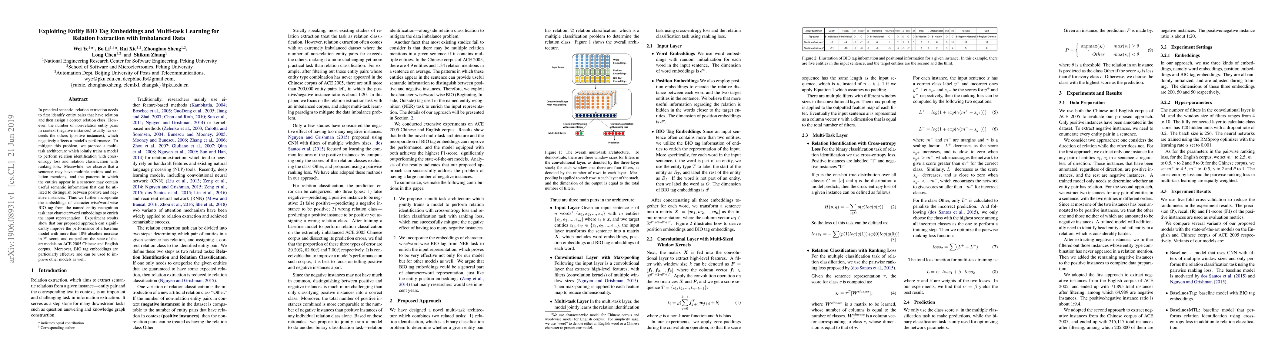 This research paper proposes a multi-task architecture to improve relation extraction performance on imbalanced data, leveraging entity BIO tag embeddings and ranking loss, resulting in over 10% F1-score increase.