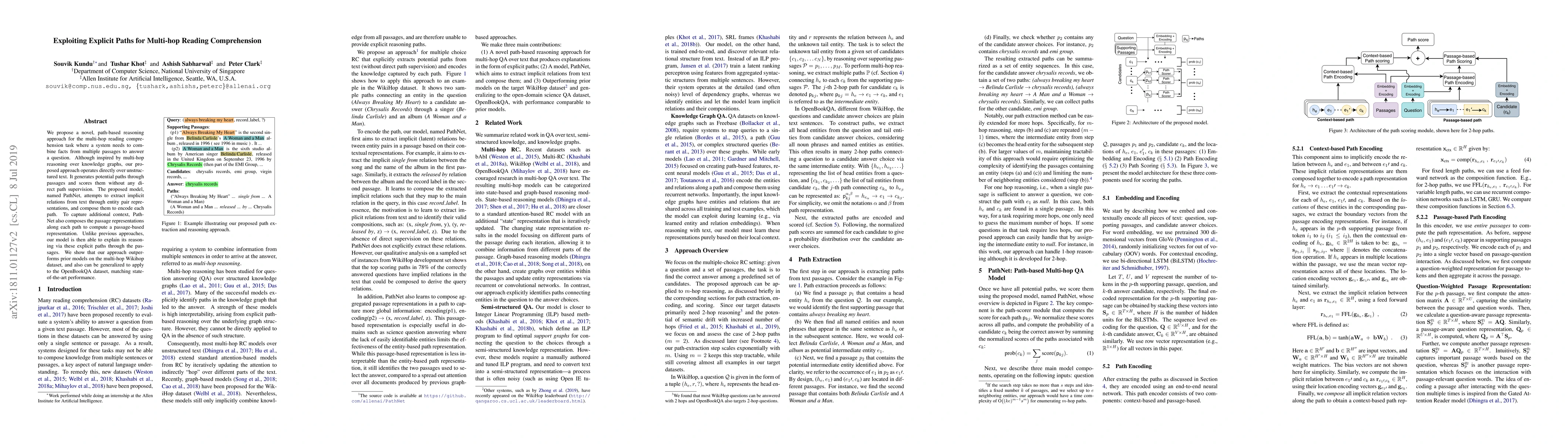 The paper introduces PathNet, a novel path-based reasoning model for multi-hop reading comprehension that directly operates on unstructured text to generate and score potential reasoning paths without supervision. PathNet outperforms prior models on the Wikihop dataset and matches state-of-the-art performance on OpenBookQA.