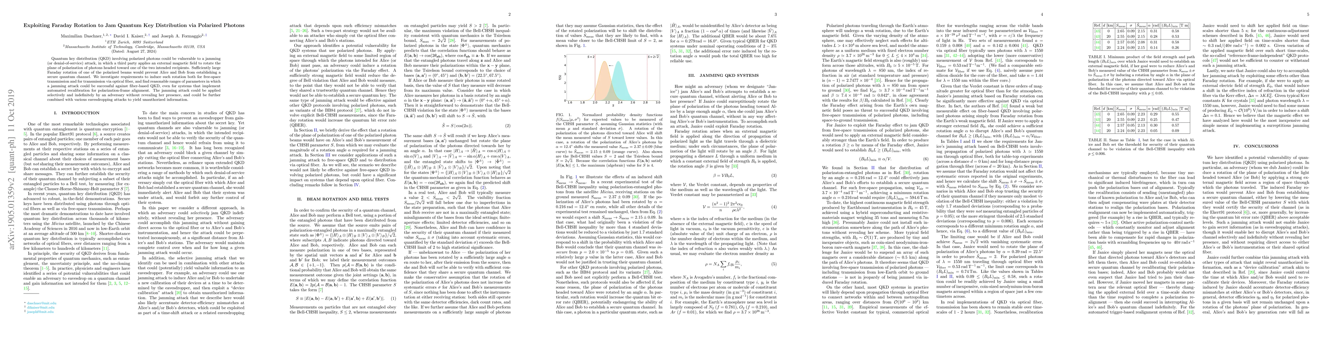 Quantum key distribution (QKD) involving polarized photons could be vulnerable to a jamming (or denial-of-service) attack, in which a third party applies an external magnetic field to rotate the plane of polarization of photons headed toward one of the two intended recipients. Sufficiently large Faraday rotation of one of the polarized beams would prevent Alice and Bob from establishing a secure quantum channel. We investigate requirements to induce such rotation both for free-space transmission and for transmission via optical fiber, and find reasonable ranges of parameters in which a jamming attack could be successful against fiber-based QKD, even for systems that implement automated recalibration for polarization-frame alignment. The jamming attack could be applied selectively and indefinitely by an adversary without revealing her presence, and could be further combined with various eavesdropping attacks to yield unauthorized information.