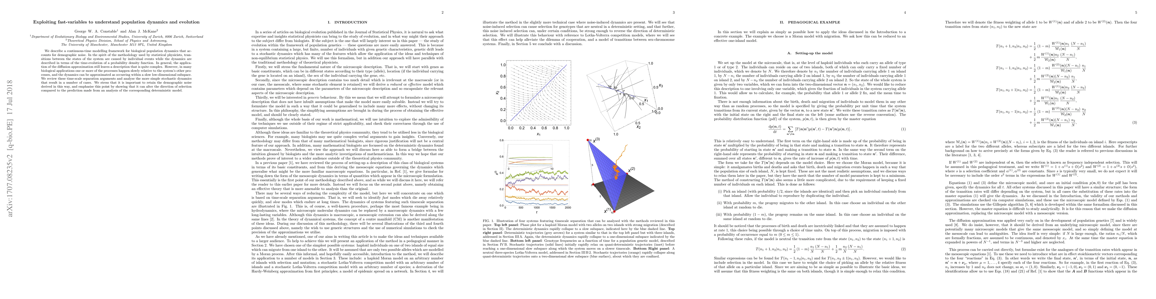 We describe a continuous-time modelling framework for biological population dynamics that accounts for demographic noise. In the spirit of the methodology used by statistical physicists, transitions between the states of the system are caused by individual events while the dynamics are described in terms of the time-evolution of a probability density function. In general, the application of the diffusion approximation still leaves a description that is quite complex. However, in many biological applications one or more of the processes happen slowly relative to the system's other processes, and the dynamics can be approximated as occurring within a slow low-dimensional subspace. We review these time-scale separation arguments and analyse the more simple stochastic dynamics that result in a number of cases. We stress that it is important to retain the demographic noise derived in this way, and emphasise this point by showing that it can alter the direction of selection compared to the prediction made from an analysis of the corresponding deterministic model.