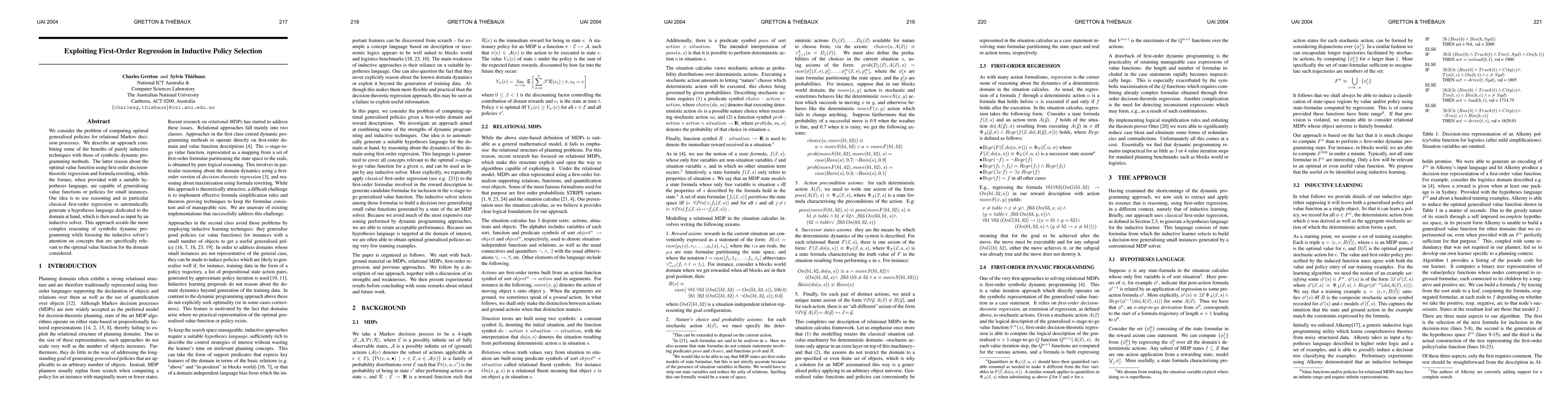 We consider the problem of computing optimal generalised policies for relational Markov decision processes. We describe an approach combining some of the benefits of purely inductive techniques with those of symbolic dynamic programming methods. The latter reason about the optimal value function using first-order decision theoretic regression and formula rewriting, while the former, when provided with a suitable hypotheses language, are capable of generalising value functions or policies for small instances. Our idea is to use reasoning and in particular classical first-order regression to automatically generate a hypotheses language dedicated to the domain at hand, which is then used as input by an inductive solver. This approach avoids the more complex reasoning of symbolic dynamic programming while focusing the inductive solver's attention on concepts that are specifically relevant to the optimal value function for the domain considered.