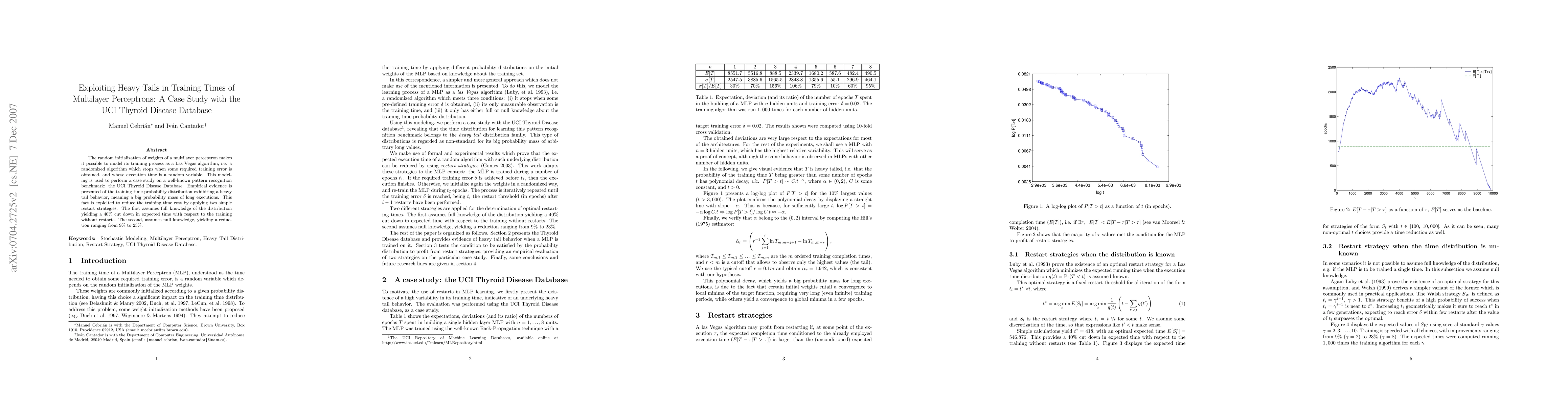 The random initialization of weights of a multilayer perceptron makes it possible to model its training process as a Las Vegas algorithm, i.e. a randomized algorithm which stops when some required training error is obtained, and whose execution time is a random variable. This modeling is used to perform a case study on a well-known pattern recognition benchmark: the UCI Thyroid Disease Database. Empirical evidence is presented of the training time probability distribution exhibiting a heavy tail behavior, meaning a big probability mass of long executions. This fact is exploited to reduce the training time cost by applying two simple restart strategies. The first assumes full knowledge of the distribution yielding a 40% cut down in expected time with respect to the training without restarts. The second, assumes null knowledge, yielding a reduction ranging from 9% to 23%.