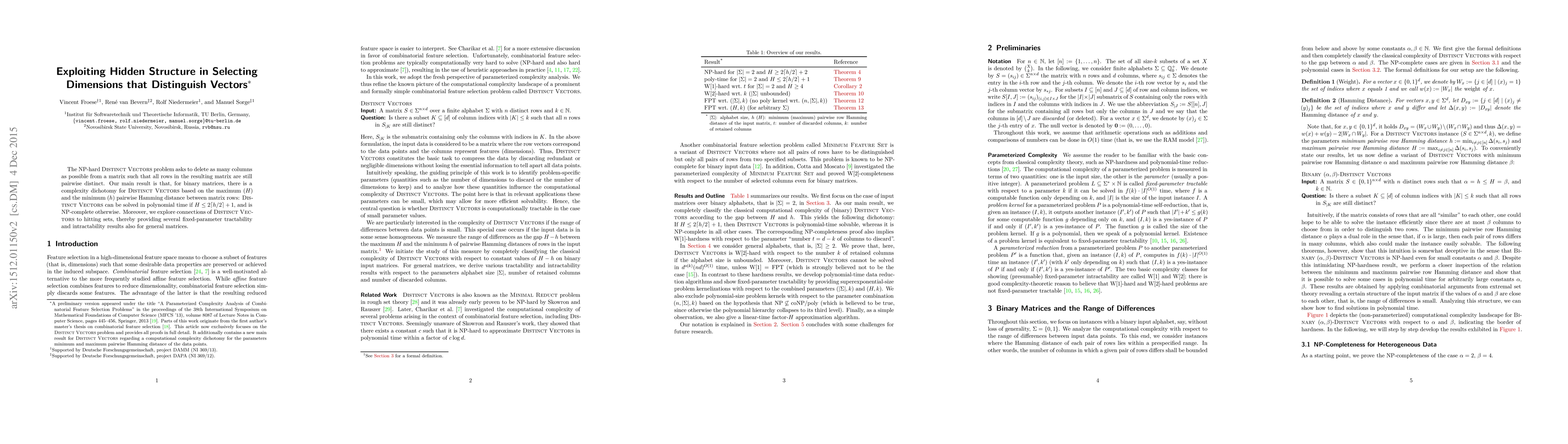 The NP-hard Distinct Vectors problem asks to delete as many columns as possible from a matrix such that all rows in the resulting matrix are still pairwise distinct. Our main result is that, for binary matrices, there is a complexity dichotomy for Distinct Vectors based on the maximum (H) and the minimum (h) pairwise Hamming distance between matrix rows: Distinct Vectors can be solved in polynomial time if H <= 2 ceil(h/2) + 1, and is NP-complete otherwise. Moreover, we explore connections of Distinct Vectors to hitting sets, thereby providing several fixed-parameter tractability and intractability results also for general matrices.