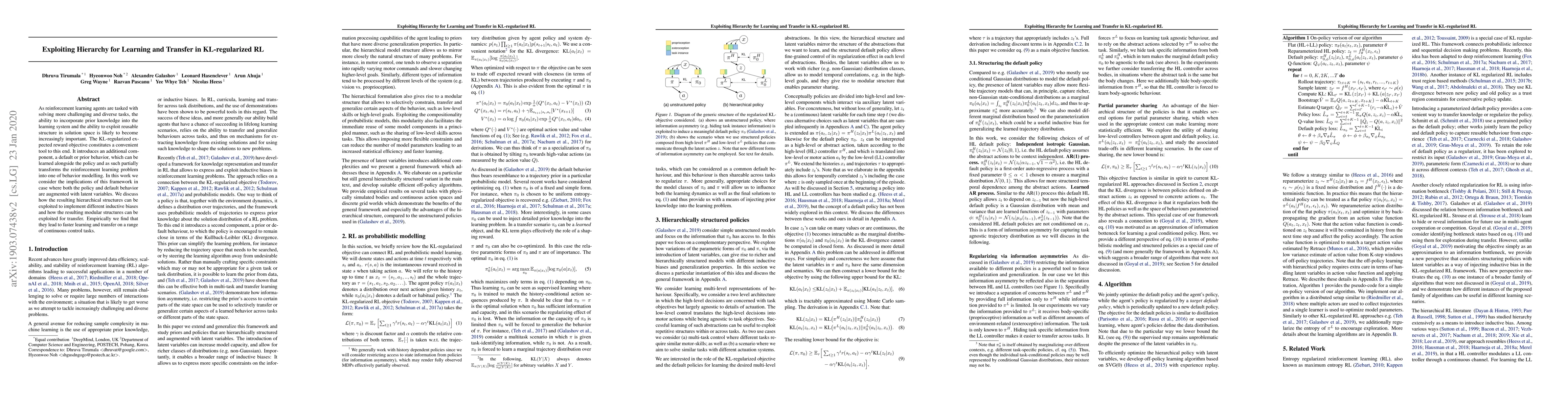 As reinforcement learning agents are tasked with solving more challenging and diverse tasks, the ability to incorporate prior knowledge into the learning system and to exploit reusable structure in solution space is likely to become increasingly important. The KL-regularized expected reward objective constitutes one possible tool to this end. It introduces an additional component, a default or prior behavior, which can be learned alongside the policy and as such partially transforms the reinforcement learning problem into one of behavior modelling. In this work we consider the implications of this framework in cases where both the policy and default behavior are augmented with latent variables. We discuss how the resulting hierarchical structures can be used to implement different inductive biases and how their modularity can benefit transfer. Empirically we find that they can lead to faster learning and transfer on a range of continuous control tasks.