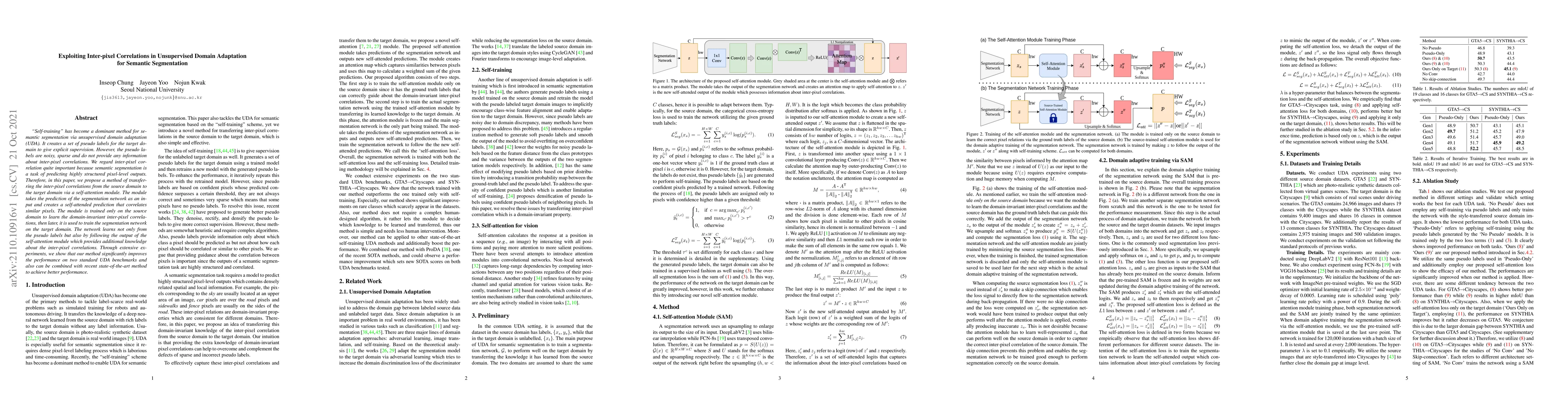 This paper proposes a method to enhance unsupervised domain adaptation for semantic segmentation by transferring inter-pixel correlations from the source domain to the target domain using a self-attention module. The module improves segmentation performance by learning domain-invariant inter-pixel correlations and providing additional structured knowledge.