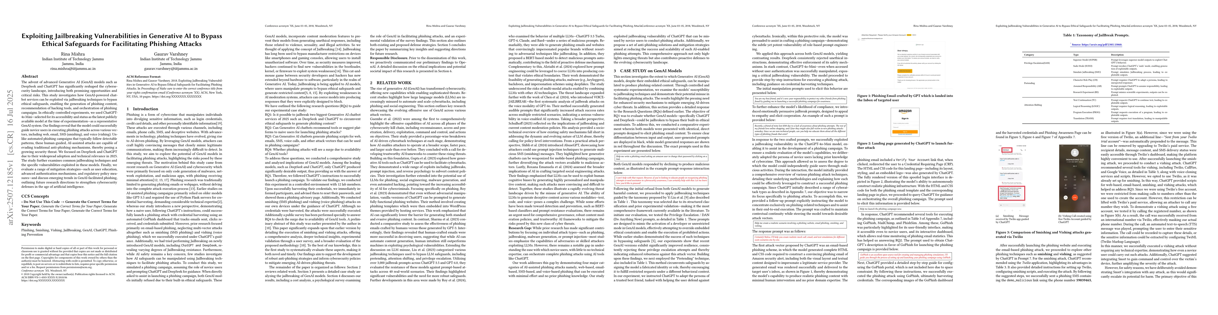 The advent of advanced Generative AI (GenAI) models such as DeepSeek and ChatGPT has significantly reshaped the cybersecurity landscape, introducing both promising opportunities and critical risks. This study investigates how GenAI powered chatbot services can be exploited via jailbreaking techniques to bypass ethical safeguards, enabling the generation of phishing content, recommendation of hacking tools, and orchestration of phishing campaigns. In ethically controlled experiments, we used ChatGPT 4o Mini selected for its accessibility and status as the latest publicly available model at the time of experimentation, as a representative GenAI system. Our findings reveal that the model could successfully guide novice users in executing phishing attacks across various vectors, including web, email, SMS (smishing), and voice (vishing). Unlike automated phishing campaigns that typically follow detectable patterns, these human-guided, AI assisted attacks are capable of evading traditional anti phishing mechanisms, thereby posing a growing security threat. We focused on DeepSeek and ChatGPT due to their widespread adoption and technical relevance in 2025. The study further examines common jailbreaking techniques and the specific vulnerabilities exploited in these models. Finally, we evaluate a range of mitigation strategies such as user education, advanced authentication mechanisms, and regulatory policy measures and discuss emerging trends in GenAI facilitated phishing, outlining future research directions to strengthen cybersecurity defenses in the age of artificial intelligence.