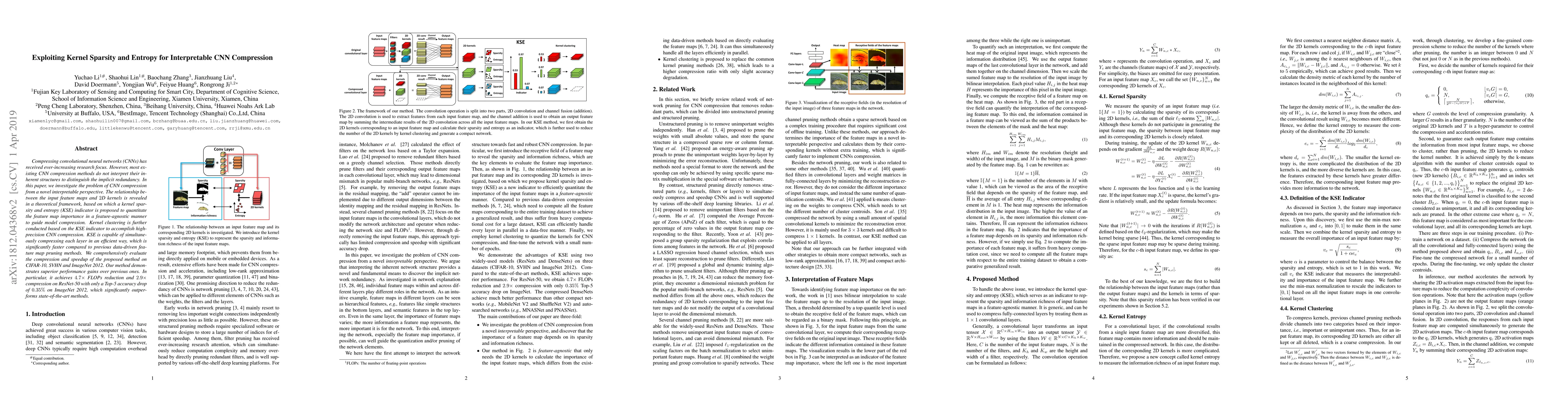 Compressing convolutional neural networks (CNNs) has received ever-increasing research focus. However, most existing CNN compression methods do not interpret their inherent structures to distinguish the implicit redundancy. In this paper, we investigate the problem of CNN compression from a novel interpretable perspective. The relationship between the input feature maps and 2D kernels is revealed in a theoretical framework, based on which a kernel sparsity and entropy (KSE) indicator is proposed to quantitate the feature map importance in a feature-agnostic manner to guide model compression. Kernel clustering is further conducted based on the KSE indicator to accomplish high-precision CNN compression. KSE is capable of simultaneously compressing each layer in an efficient way, which is significantly faster compared to previous data-driven feature map pruning methods. We comprehensively evaluate the compression and speedup of the proposed method on CIFAR-10, SVHN and ImageNet 2012. Our method demonstrates superior performance gains over previous ones. In particular, it achieves 4.7 \times FLOPs reduction and 2.9 \times compression on ResNet-50 with only a Top-5 accuracy drop of 0.35% on ImageNet 2012, which significantly outperforms state-of-the-art methods.