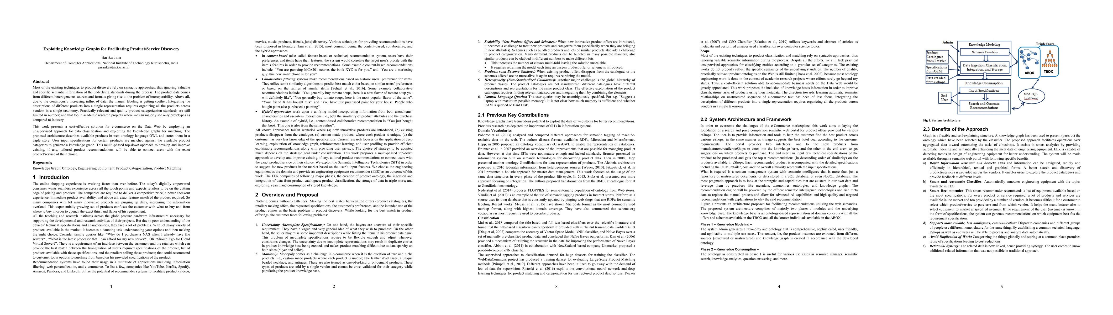 Most of the existing techniques to product discovery rely on syntactic approaches, thus ignoring valuable and specific semantic information of the underlying standards during the process. The product data comes from different heterogeneous sources and formats giving rise to the problem of interoperability. Above all, due to the continuously increasing influx of data, the manual labeling is getting costlier. Integrating the descriptions of different products into a single representation requires organizing all the products across vendors in a single taxonomy. Practically relevant and quality product categorization standards are still limited in number; and that too in academic research projects where we can majorly see only prototypes as compared to industry. This work presents a cost-effective solution for e-commerce on the Data Web by employing an unsupervised approach for data classification and exploiting the knowledge graphs for matching. The proposed architecture describes available products in web ontology language OWL and stores them in a triple store. User input specifications for certain products are matched against the available product categories to generate a knowledge graph. This mullti-phased top-down approach to develop and improve existing, if any, tailored product recommendations will be able to connect users with the exact product/service of their choice.