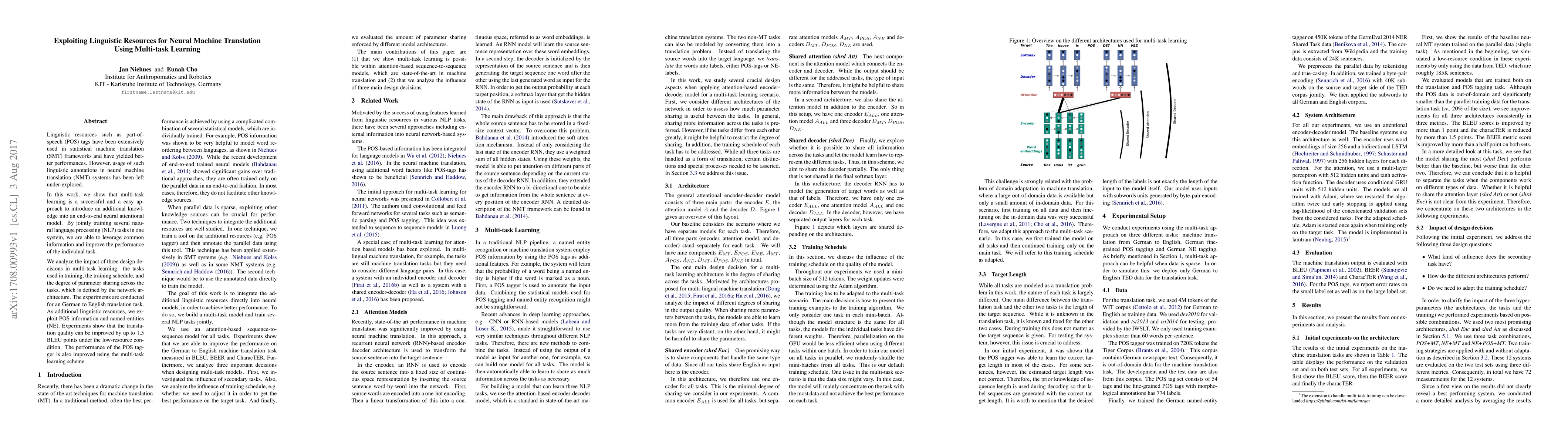 This paper explores the integration of linguistic resources like POS tags and named-entities into neural machine translation using multi-task learning, showing an improvement of up to 1.5 BLEU points in translation quality under low-resource conditions. The study analyzes various multi-task learning design decisions and demonstrates improved performance in both translation and POS tagging.