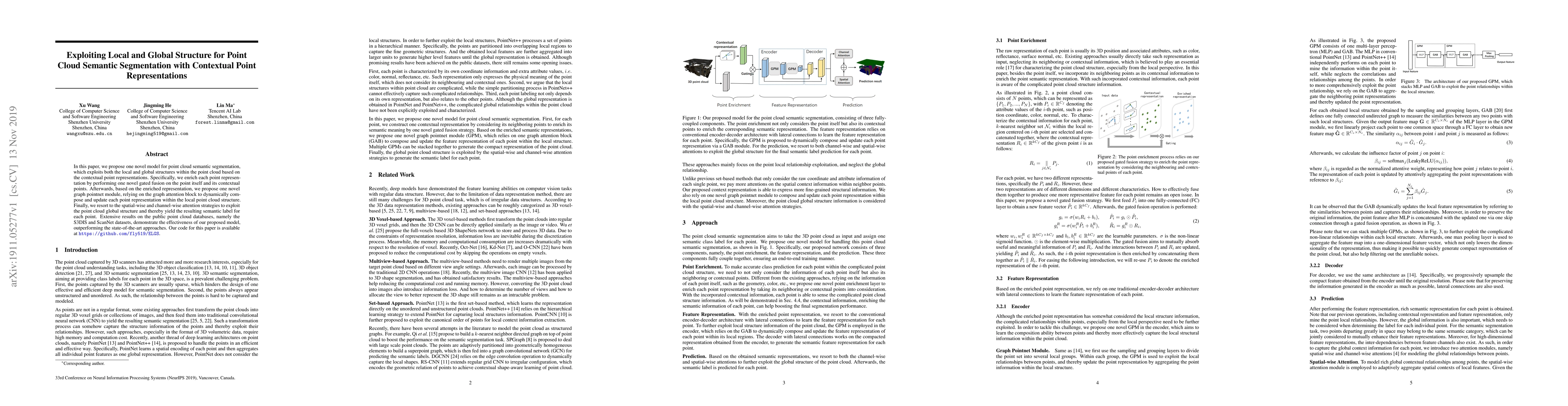 This paper introduces a novel model for point cloud semantic segmentation that leverages both local and global structures through enriched contextual point representations. It uses a gated fusion and a graph pointnet module with graph attention to refine point representations, followed by spatial-wise and channel-wise attention to exploit global context, achieving superior performance on S3DIS and ScanNet datasets.