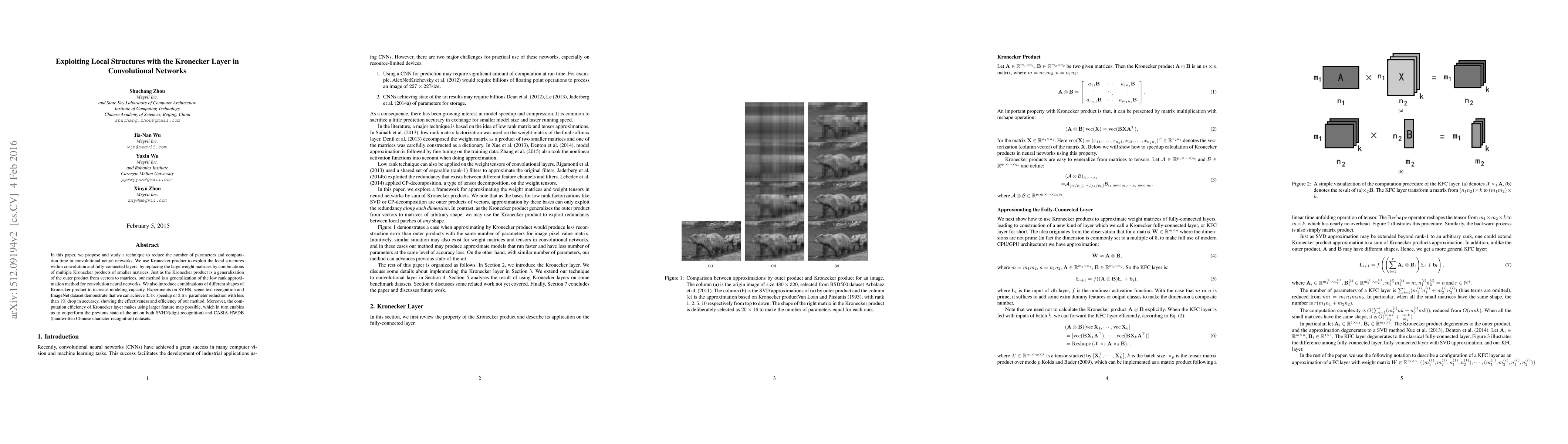 In this paper, we propose and study a technique to reduce the number of parameters and computation time in convolutional neural networks. We use Kronecker product to exploit the local structures within convolution and fully-connected layers, by replacing the large weight matrices by combinations of multiple Kronecker products of smaller matrices. Just as the Kronecker product is a generalization of the outer product from vectors to matrices, our method is a generalization of the low rank approximation method for convolution neural networks. We also introduce combinations of different shapes of Kronecker product to increase modeling capacity. Experiments on SVHN, scene text recognition and ImageNet dataset demonstrate that we can achieve $3.3 \times$ speedup or $3.6 \times$ parameter reduction with less than 1\% drop in accuracy, showing the effectiveness and efficiency of our method. Moreover, the computation efficiency of Kronecker layer makes using larger feature map possible, which in turn enables us to outperform the previous state-of-the-art on both SVHN(digit recognition) and CASIA-HWDB (handwritten Chinese character recognition) datasets.