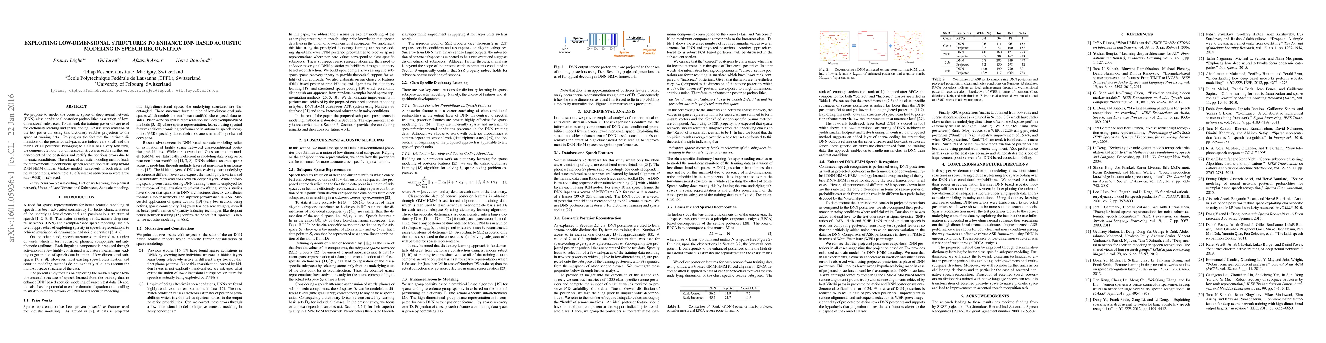 This paper proposes a method to enhance DNN-based acoustic modeling in speech recognition by modeling the acoustic space using low-dimensional subspaces derived from dictionary learning and sparse coding. This approach leads to a 15.4% relative reduction in word error rate in continuous speech recognition tasks under both clean and noisy conditions.