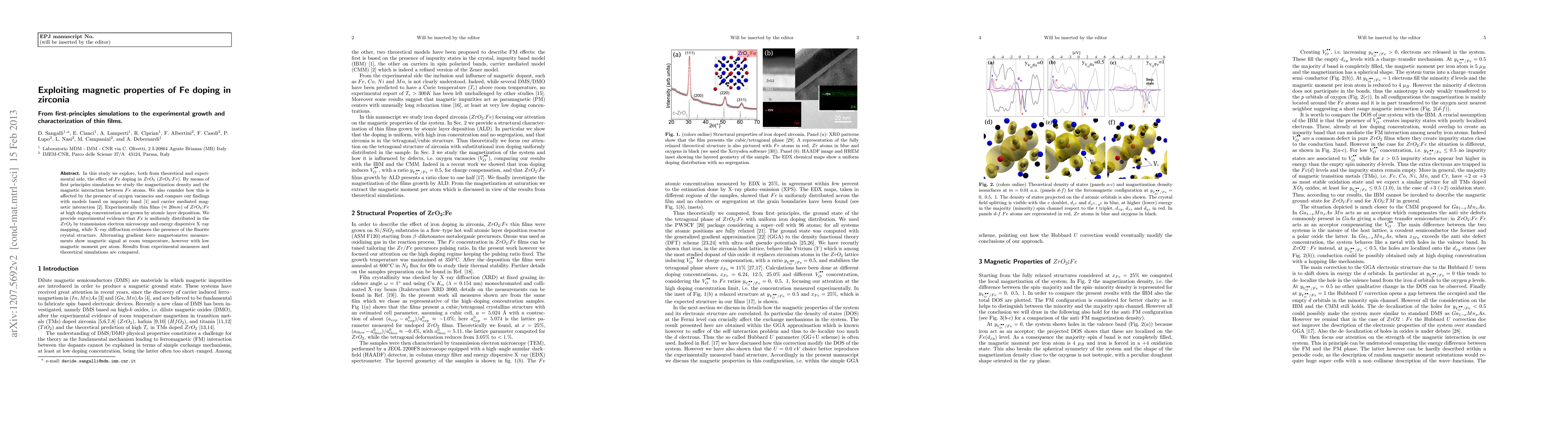 In this study we explore, both from theoretical and experimental side, the effect of Fe doping in ZrO2 (ZrO2:Fe). By means of first principles simulation we study the magnetization density and the magnetic interaction between Fe atoms. We also consider how this is affected by the presence of oxygen vacancies and compare our findings with models based on impurity band and carrier mediated magnetic interaction. Experimentally thin films (~ 20 nm) of ZrO2:Fe at high doping concentration are grown by atomic layer deposition. We provide experimental evidence that Fe is uniformly distributed in the ZrO2 by transmission electron microscopy and energy dispersive X-ray mapping, while X-ray diffraction evidences the presence of the fluorite crystal structure. Alternating gradient force magnetometer measurements show magnetic signal at room temperature, however with low magnetic moment per atom. Results from experimental measures and theoretical simulations are compared.
