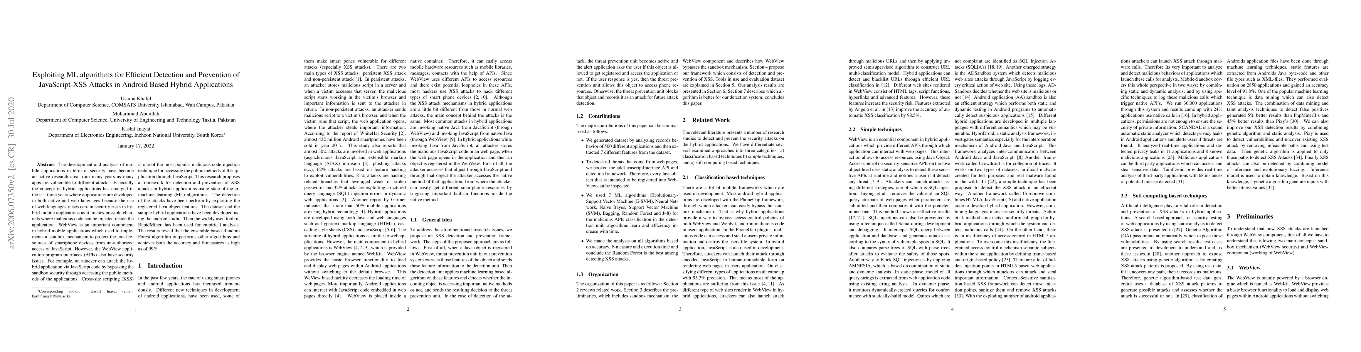 This research proposes a machine learning framework to detect and prevent JavaScript-XSS attacks in hybrid Android applications by analyzing registered Java object features. The study finds that the Random Forest algorithm achieves 99% accuracy and F-measure in detecting XSS attacks, outperforming other ML algorithms.
