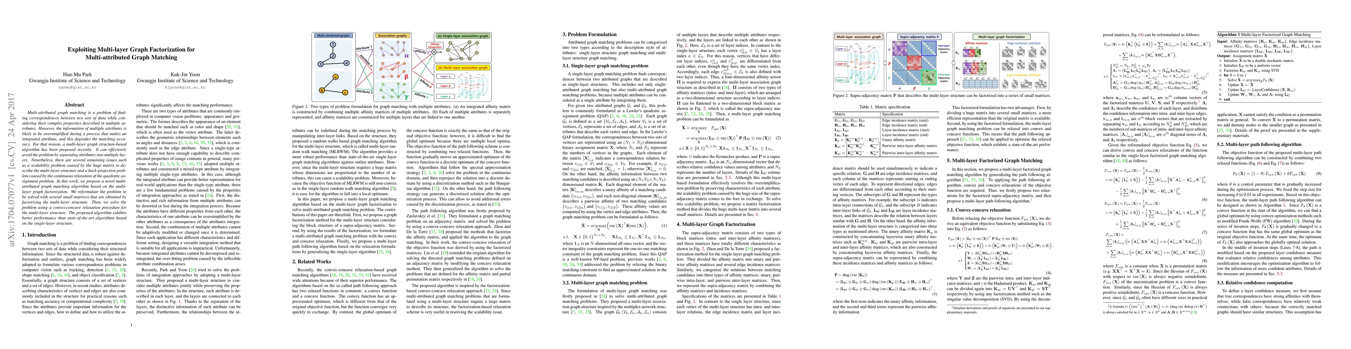 Multi-attributed graph matching is a problem of finding correspondences between two sets of data while considering their complex properties described in multiple attributes. However, the information of multiple attributes is likely to be oversimplified during a process that makes an integrated attribute, and this degrades the matching accuracy. For that reason, a multi-layer graph structure-based algorithm has been proposed recently. It can effectively avoid the problem by separating attributes into multiple layers. Nonetheless, there are several remaining issues such as a scalability problem caused by the huge matrix to describe the multi-layer structure and a back-projection problem caused by the continuous relaxation of the quadratic assignment problem. In this work, we propose a novel multi-attributed graph matching algorithm based on the multi-layer graph factorization. We reformulate the problem to be solved with several small matrices that are obtained by factorizing the multi-layer structure. Then, we solve the problem using a convex-concave relaxation procedure for the multi-layer structure. The proposed algorithm exhibits better performance than state-of-the-art algorithms based on the single-layer structure.