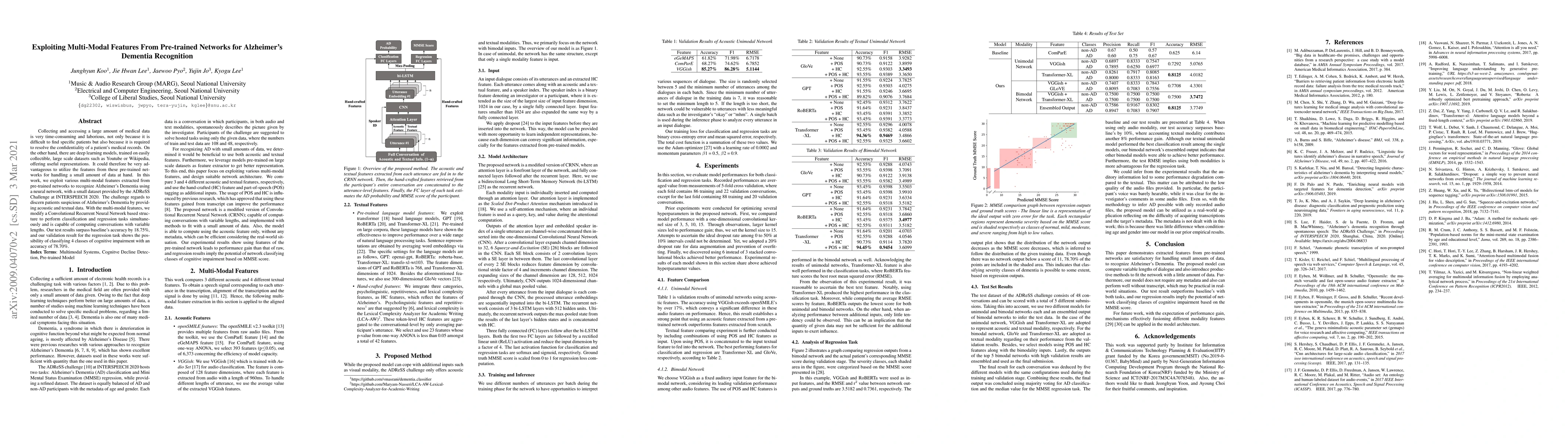 Collecting and accessing a large amount of medical data is very time-consuming and laborious, not only because it is difficult to find specific patients but also because it is required to resolve the confidentiality of a patient's medical records. On the other hand, there are deep learning models, trained on easily collectible, large scale datasets such as Youtube or Wikipedia, offering useful representations. It could therefore be very advantageous to utilize the features from these pre-trained networks for handling a small amount of data at hand. In this work, we exploit various multi-modal features extracted from pre-trained networks to recognize Alzheimer's Dementia using a neural network, with a small dataset provided by the ADReSS Challenge at INTERSPEECH 2020. The challenge regards to discern patients suspicious of Alzheimer's Dementia by providing acoustic and textual data. With the multi-modal features, we modify a Convolutional Recurrent Neural Network based structure to perform classification and regression tasks simultaneously and is capable of computing conversations with variable lengths. Our test results surpass baseline's accuracy by 18.75%, and our validation result for the regression task shows the possibility of classifying 4 classes of cognitive impairment with an accuracy of 78.70%.