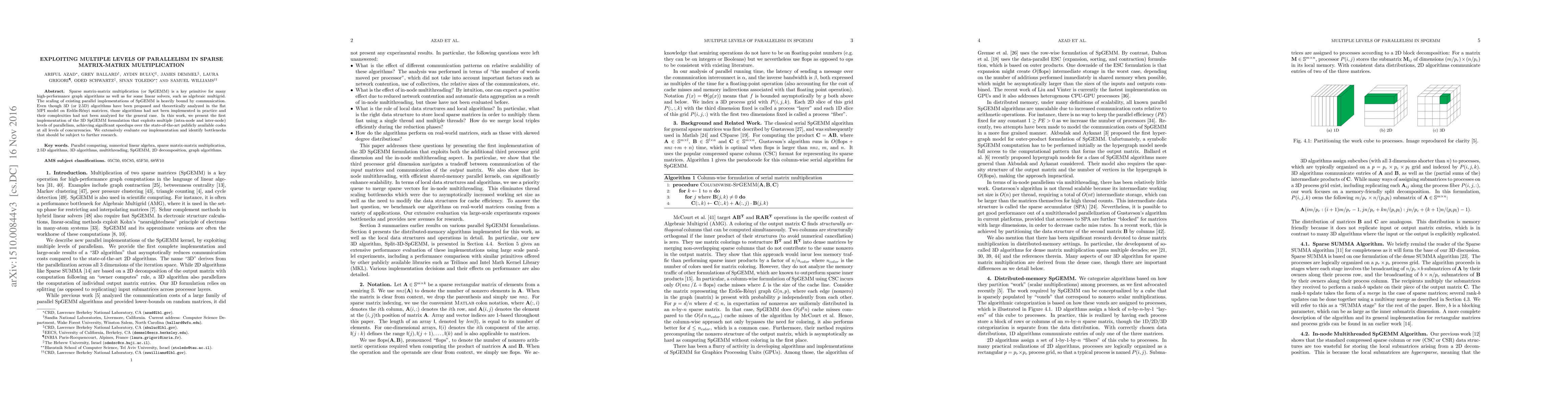 This paper presents an implementation of a 3D algorithm for sparse matrix-matrix multiplication (SpGEMM) that exploits both intra-node and inter-node parallelism, achieving significant speedups over existing methods. The study also identifies bottlenecks for future research to improve performance.