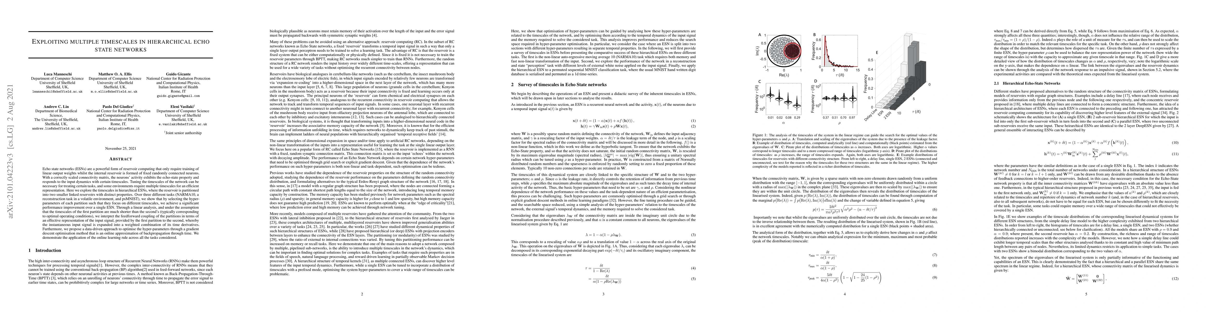 This paper investigates hierarchical Echo State Networks (ESNs) partitioned into two reservoirs with distinct timescales, demonstrating improved performance over single ESNs across various tasks. The approach optimizes hyper-parameters to focus on different timescales, achieving better results through effective representation and an online gradient descent optimization method.
