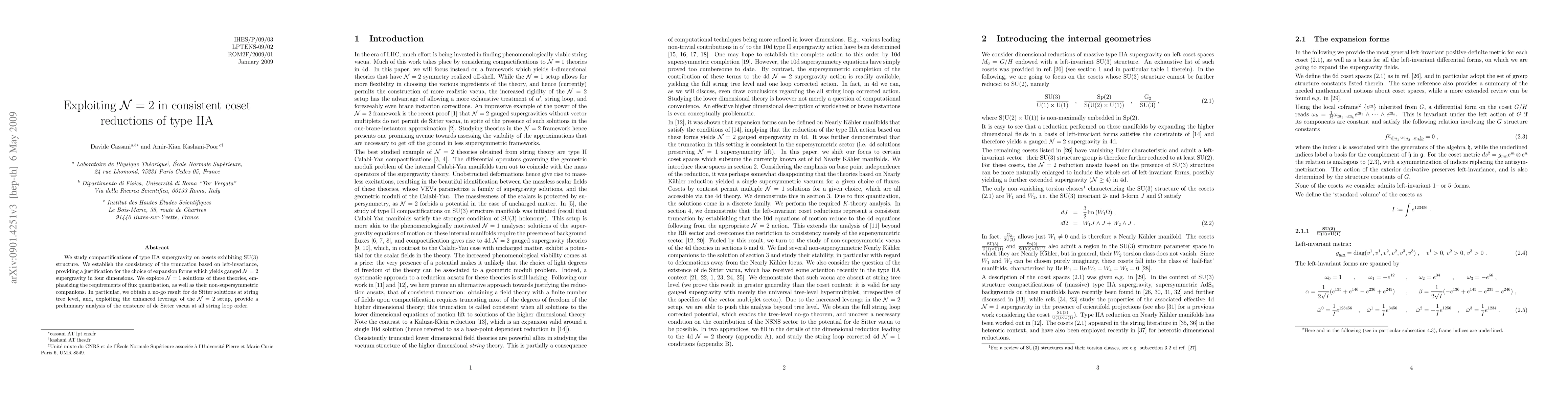 We study compactifications of type IIA supergravity on cosets exhibiting SU(3) structure. We establish the consistency of the truncation based on left-invariance, providing a justification for the choice of expansion forms which yields gauged N=2 supergravity in 4 dimensions. We explore N=1 solutions of these theories, emphasizing the requirements of flux quantization, as well as their non-supersymmetric companions. In particular, we obtain a no-go result for de Sitter solutions at string tree level, and, exploiting the enhanced leverage of the N=2 setup, provide a preliminary analysis of the existence of de Sitter vacua at all string loop order.