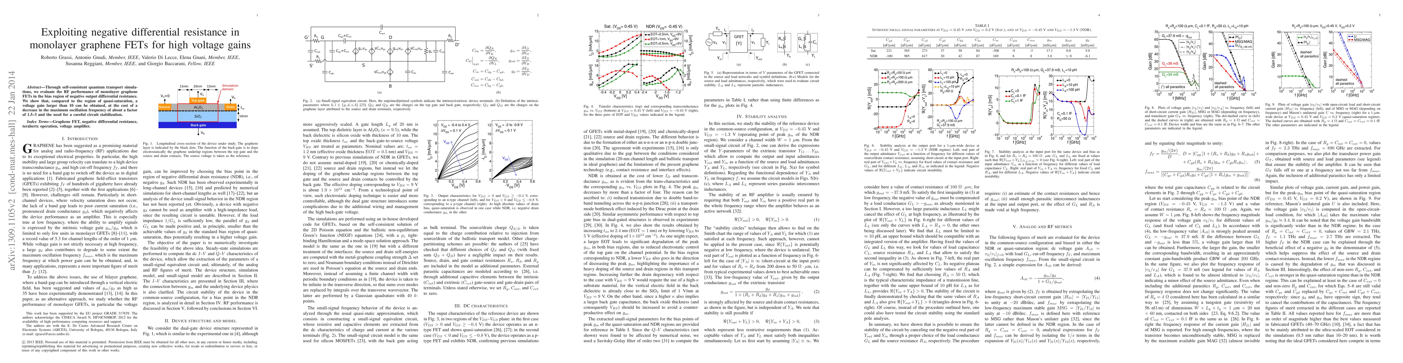 This paper explores the RF performance of monolayer graphene FETs in the negative differential resistance region, demonstrating voltage gains over 10, albeit at the expense of reduced maximum oscillation frequency and requiring circuit stabilization.