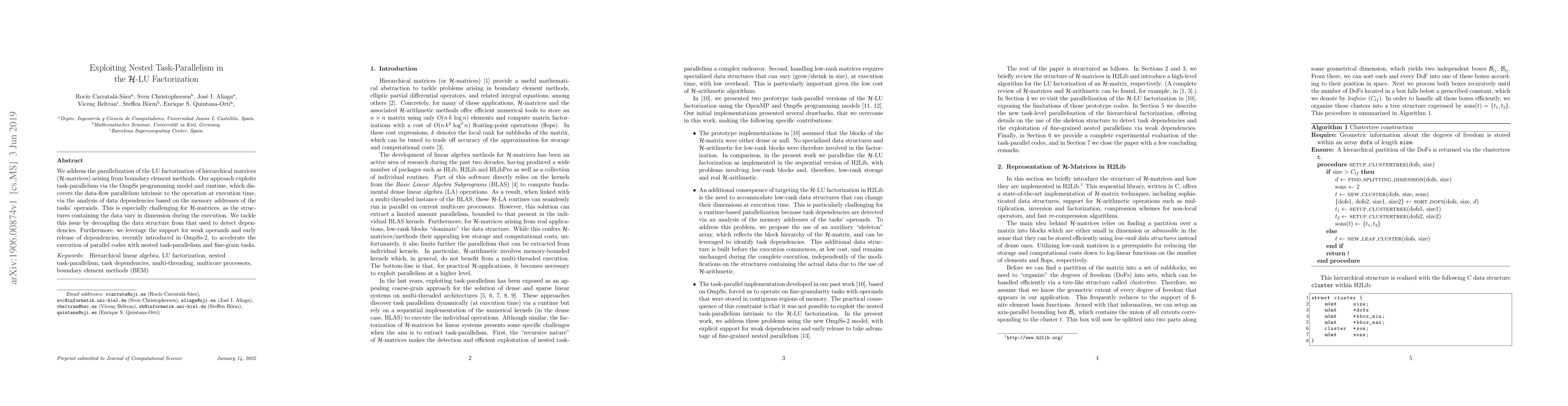 This paper explores the parallelization of LU factorization for hierarchical matrices using the OmpSs programming model, focusing on task-parallelism and dynamic data dependency analysis. It addresses the challenges of varying data structures by decoupling data representation from dependency detection, and utilizes OmpSs-2's features for enhanced performance in nested task-parallelism.