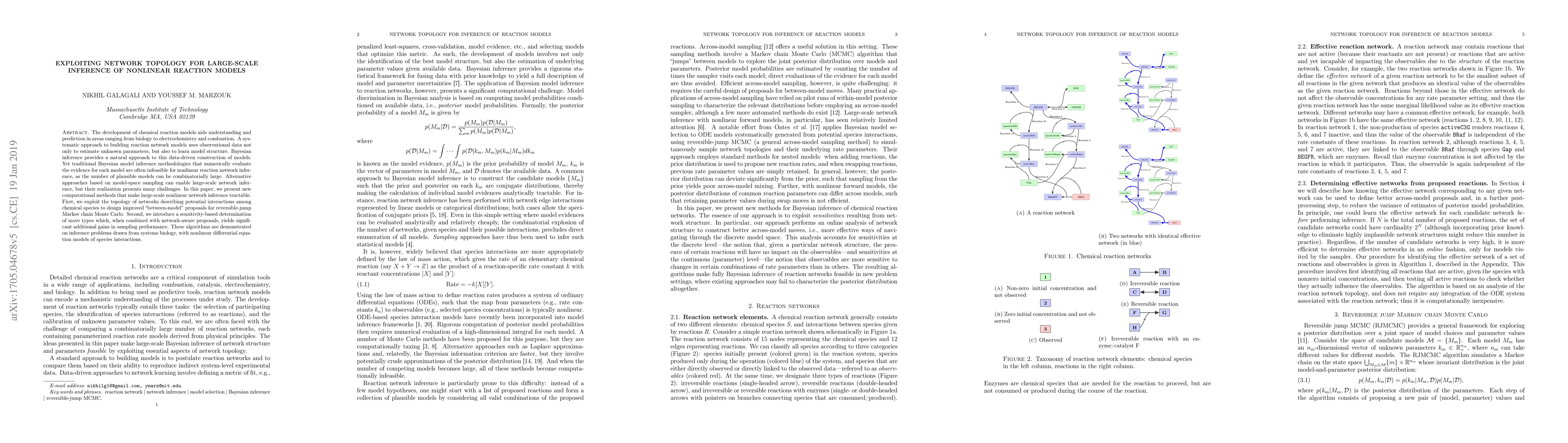 This paper develops new computational methods for large-scale inference of nonlinear reaction models by exploiting network topology. It introduces improved "between-model" proposals and sensitivity-based move types for reversible-jump Markov chain Monte Carlo, significantly enhancing sampling performance for systems biology applications.