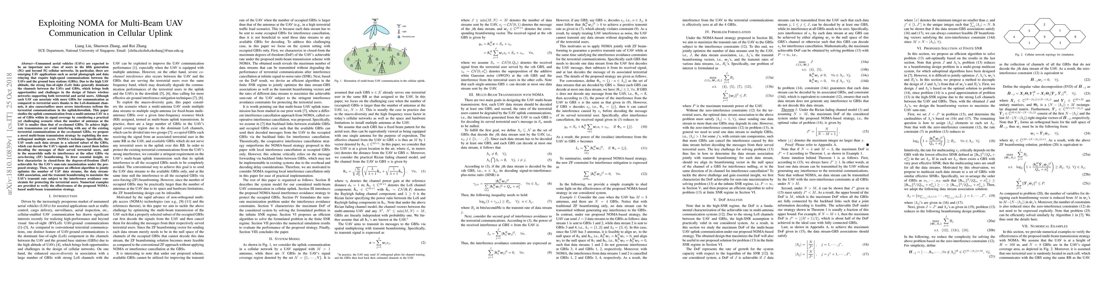 This paper proposes a multi-beam transmission strategy using non-orthogonal multiple access (NOMA) to enable high-rate uplink communication for UAVs to ground base stations (GBSs) while avoiding interference with terrestrial users. The strategy involves the UAV sending data streams to selected GBSs, which decode and cancel the UAV's signals, and employs zero-forcing beamforming to mitigate interference to other GBSs.