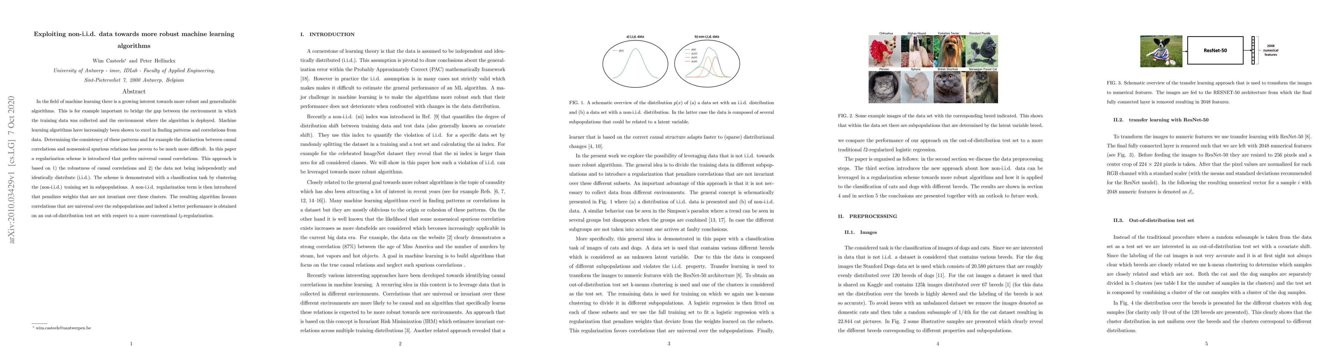In the field of machine learning there is a growing interest towards more robust and generalizable algorithms. This is for example important to bridge the gap between the environment in which the training data was collected and the environment where the algorithm is deployed. Machine learning algorithms have increasingly been shown to excel in finding patterns and correlations from data. Determining the consistency of these patterns and for example the distinction between causal correlations and nonsensical spurious relations has proven to be much more difficult. In this paper a regularization scheme is introduced that prefers universal causal correlations. This approach is based on 1) the robustness of causal correlations and 2) the data not being independently and identically distribute (i.i.d.). The scheme is demonstrated with a classification task by clustering the (non-i.i.d.) training set in subpopulations. A non-i.i.d. regularization term is then introduced that penalizes weights that are not invariant over these clusters. The resulting algorithm favours correlations that are universal over the subpopulations and indeed a better performance is obtained on an out-of-distribution test set with respect to a more conventional l_2-regularization.