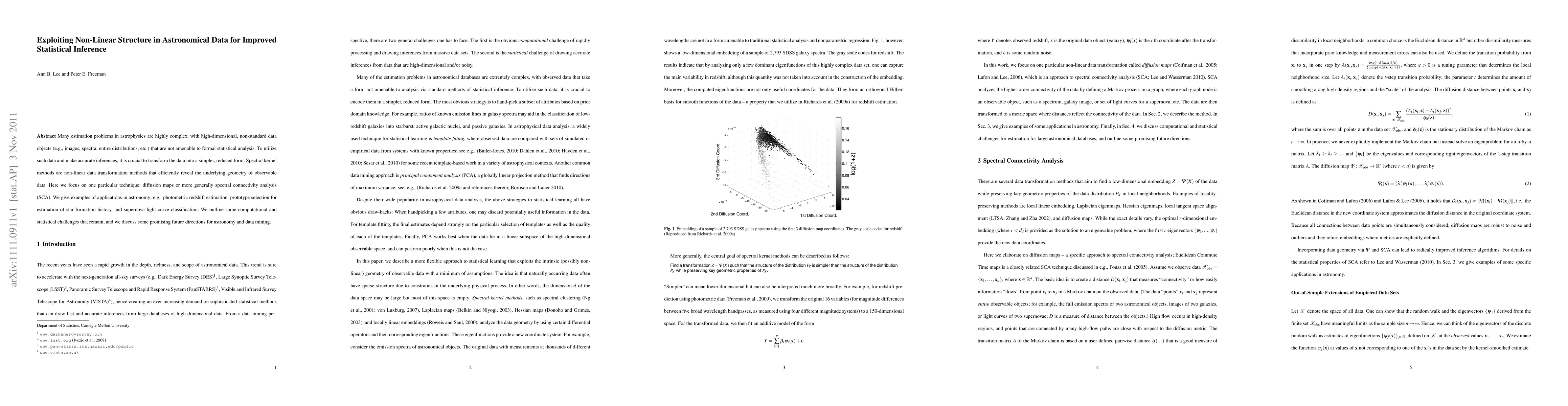 Many estimation problems in astrophysics are highly complex, with high-dimensional, non-standard data objects (e.g., images, spectra, entire distributions, etc.) that are not amenable to formal statistical analysis. To utilize such data and make accurate inferences, it is crucial to transform the data into a simpler, reduced form. Spectral kernel methods are non-linear data transformation methods that efficiently reveal the underlying geometry of observable data. Here we focus on one particular technique: diffusion maps or more generally spectral connectivity analysis (SCA). We give examples of applications in astronomy; e.g., photometric redshift estimation, prototype selection for estimation of star formation history, and supernova light curve classification. We outline some computational and statistical challenges that remain, and we discuss some promising future directions for astronomy and data mining.