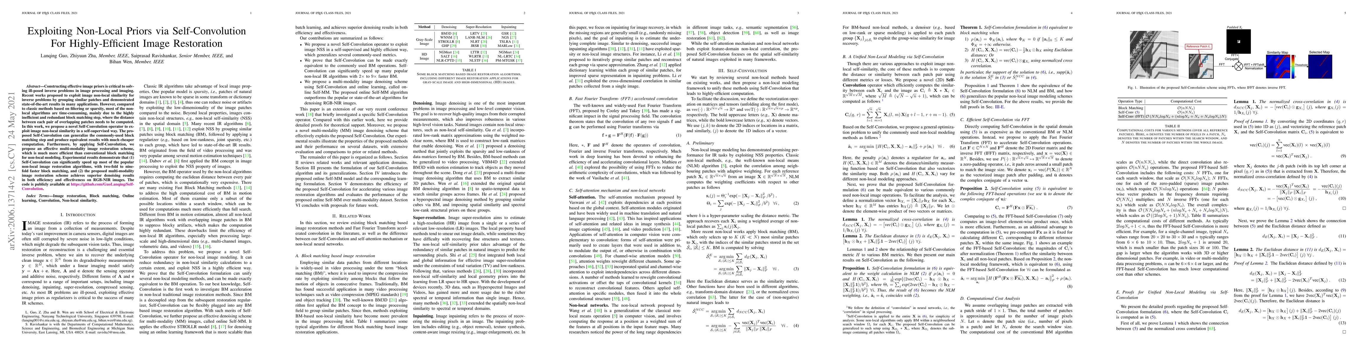 Constructing effective image priors is critical to solving ill-posed inverse problems in image processing and imaging. Recent works proposed to exploit image non-local similarity for inverse problems by grouping similar patches and demonstrated state-of-the-art results in many applications. However, compared to classic methods based on filtering or sparsity, most of the non-local algorithms are time-consuming, mainly due to the highly inefficient and redundant block matching step, where the distance between each pair of overlapping patches needs to be computed. In this work, we propose a novel Self-Convolution operator to exploit image non-local similarity in a self-supervised way. The proposed Self-Convolution can generalize the commonly-used block matching step and produce equivalent results with much cheaper computation. Furthermore, by applying Self-Convolution, we propose an effective multi-modality image restoration scheme, which is much more efficient than conventional block matching for non-local modeling. Experimental results demonstrate that (1) Self-Convolution can significantly speed up most of the popular non-local image restoration algorithms, with two-fold to nine-fold faster block matching, and (2) the proposed multi-modality image restoration scheme achieves superior denoising results in both efficiency and effectiveness on RGB-NIR images. The code is publicly available at \href{https://github.com/GuoLanqing/Self-Convolution}.