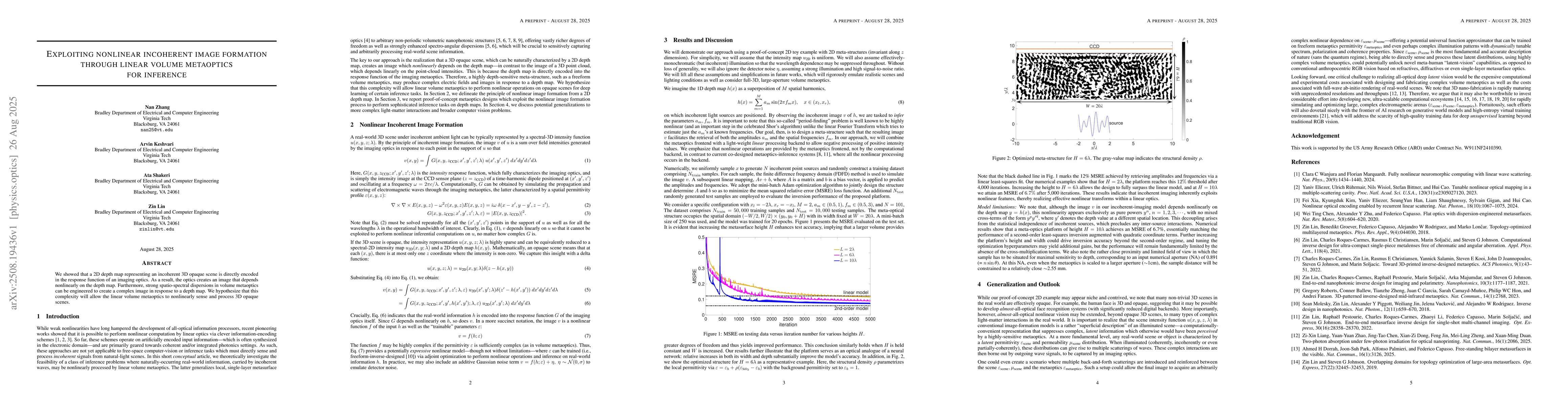 We showed that a 2D depth map representing an incoherent 3D opaque scene is directly encoded in the response function of an imaging optics. As a result, the optics creates an image that depends nonlinearly on the depth map. Furthermore, strong spatio-spectral dispersions in volume metaoptics can be engineered to create a complex image in response to a depth map. We hypothesize that this complexity will allow the linear volume metaoptics to nonlinearly sense and process 3D opaque scenes.