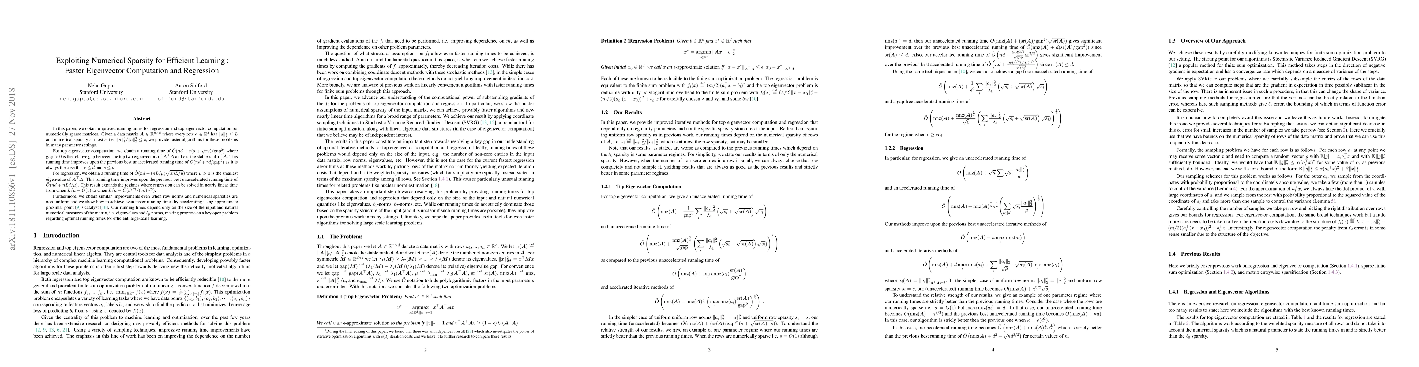 In this paper, we obtain improved running times for regression and top eigenvector computation for numerically sparse matrices. Given a data matrix $A \in \mathbb{R}^{n \times d}$ where every row $a \in \mathbb{R}^d$ has $\|a\|_2^2 \leq L$ and numerical sparsity at most $s$, i.e. $\|a\|_1^2 / \|a\|_2^2 \leq s$, we provide faster algorithms for these problems in many parameter settings. For top eigenvector computation, we obtain a running time of $\tilde{O}(nd + r(s + \sqrt{r s}) / \mathrm{gap}^2)$ where $\mathrm{gap} > 0$ is the relative gap between the top two eigenvectors of $A^\top A$ and $r$ is the stable rank of $A$. This running time improves upon the previous best unaccelerated running time of $O(nd + r d / \mathrm{gap}^2)$ as it is always the case that $r \leq d$ and $s \leq d$. For regression, we obtain a running time of $\tilde{O}(nd + (nL / \mu) \sqrt{s nL / \mu})$ where $\mu > 0$ is the smallest eigenvalue of $A^\top A$. This running time improves upon the previous best unaccelerated running time of $\tilde{O}(nd + n L d / \mu)$. This result expands the regimes where regression can be solved in nearly linear time from when $L/\mu = \tilde{O}(1)$ to when $L / \mu = \tilde{O}(d^{2/3} / (sn)^{1/3})$. Furthermore, we obtain similar improvements even when row norms and numerical sparsities are non-uniform and we show how to achieve even faster running times by accelerating using approximate proximal point [Frostig et. al. 2015] / catalyst [Lin et. al. 2015]. Our running times depend only on the size of the input and natural numerical measures of the matrix, i.e. eigenvalues and $\ell_p$ norms, making progress on a key open problem regarding optimal running times for efficient large-scale learning.