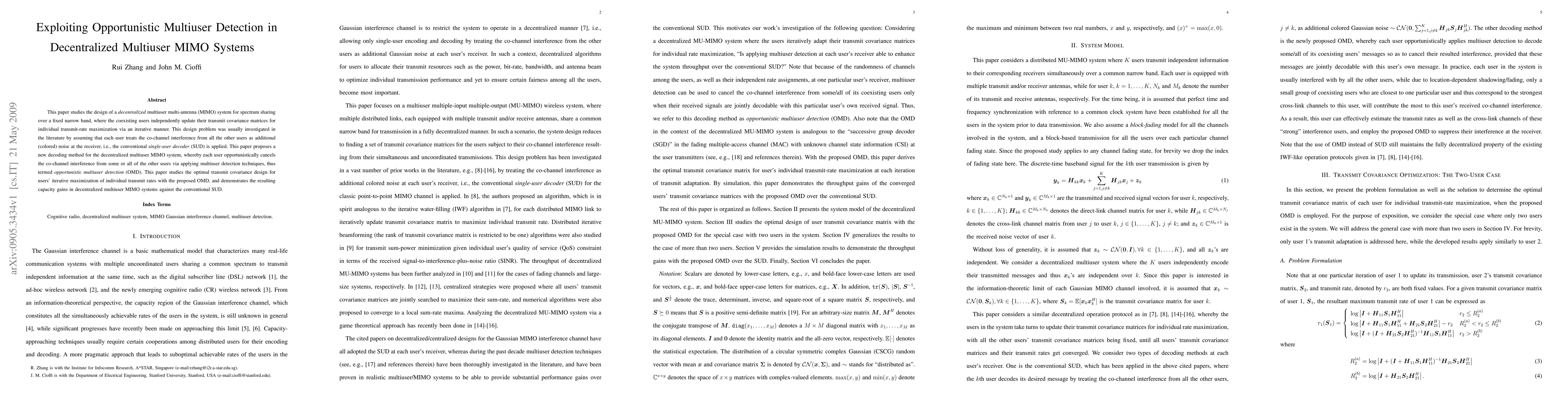 This paper proposes an opportunistic multiuser detection (OMD) method for decentralized multiuser MIMO systems to cancel co-channel interference, achieving higher individual transmit rates compared to conventional single-user decoding (SUD). It demonstrates optimal transmit covariance design and resulting capacity gains.