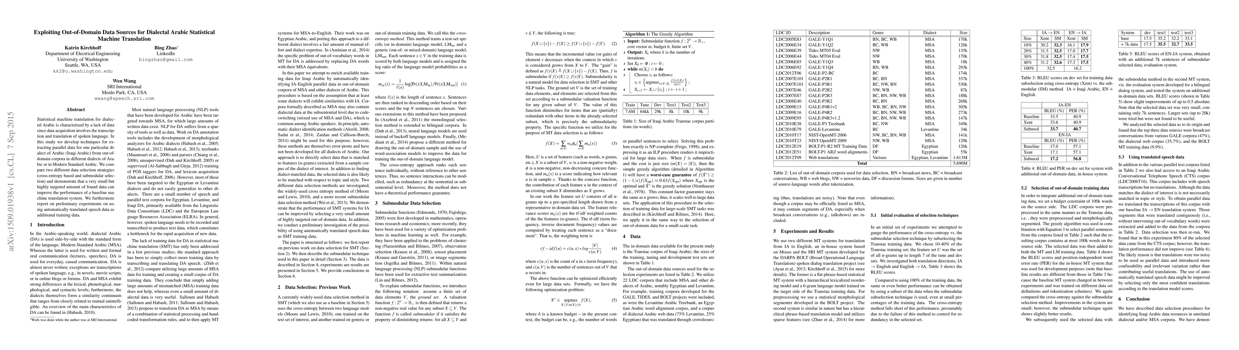This study develops methods to extract parallel data for Iraqi Arabic from out-of-domain Arabic dialects and Modern Standard Arabic to improve dialectal Arabic statistical machine translation. The effectiveness of two data selection strategies is compared, showing that targeted data can enhance translation performance.