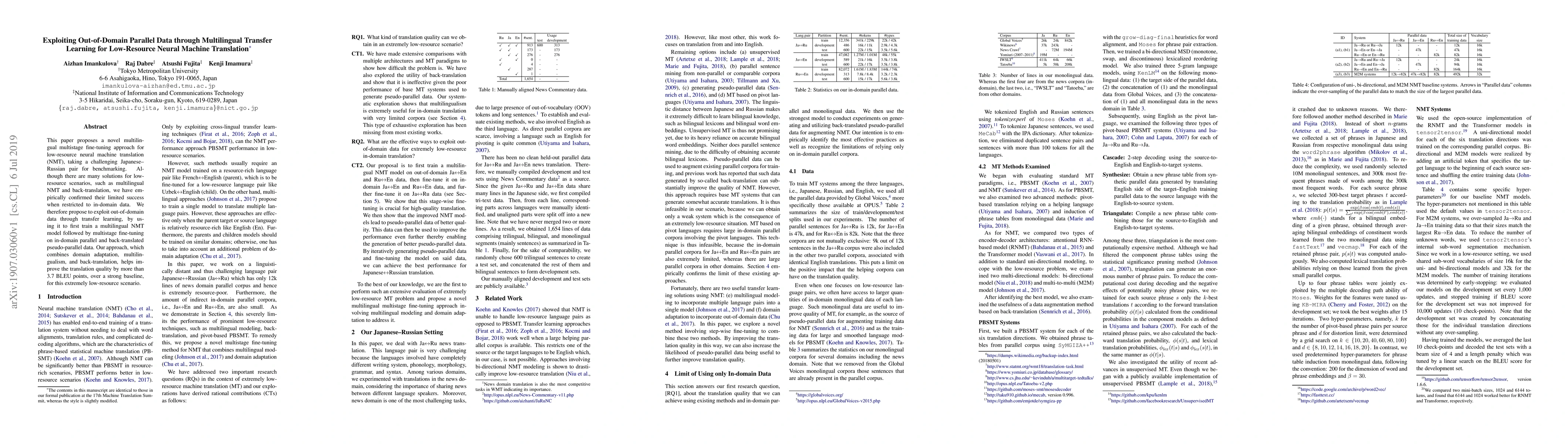 This paper introduces a multilingual multistage fine-tuning approach to enhance low-resource neural machine translation, particularly for the Japanese-Russian pair. It leverages out-of-domain data through transfer learning and fine-tuning on in-domain data, achieving a 3.7 BLEU point improvement over baselines.