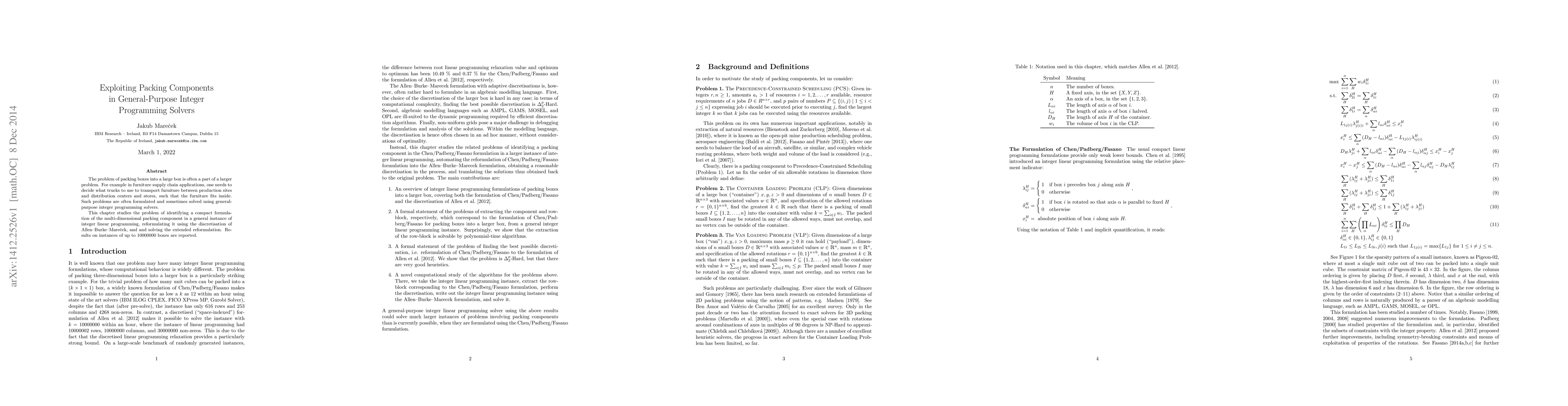 The problem of packing boxes into a large box is often a part of a larger problem. For example in furniture supply chain applications, one needs to decide what trucks to use to transport furniture between production sites and distribution centers and stores, such that the furniture fits inside. Such problems are often formulated and sometimes solved using general-purpose integer programming solvers. This chapter studies the problem of identifying a compact formulation of the multi-dimensional packing component in a general instance of integer linear programming, reformulating it using the discretisation of Allen--Burke--Marecek, and and solving the extended reformulation. Results on instances of up to 10000000 boxes are reported.