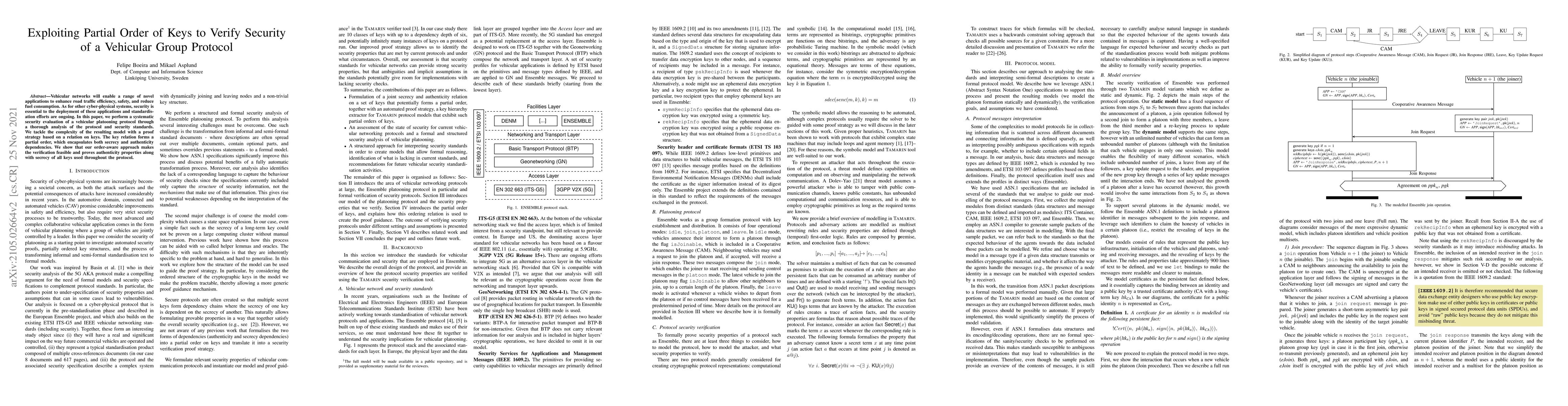 Vehicular networks will enable a range of novel applications to enhance road traffic efficiency, safety, and reduce fuel consumption. As for other cyber-physical systems, security is essential to the deployment of these applications and standardisation efforts are ongoing. In this paper, we perform a systematic security evaluation of a vehicular platooning protocol through a thorough analysis of the protocol and security standards. We tackle the complexity of the resulting model with a proof strategy based on a relation on keys. The key relation forms a partial order, which encapsulates both secrecy and authenticity dependencies. We show that our order-aware approach makes the verification feasible and proves strong authenticity properties along with secrecy of all keys used throughout the protocol.