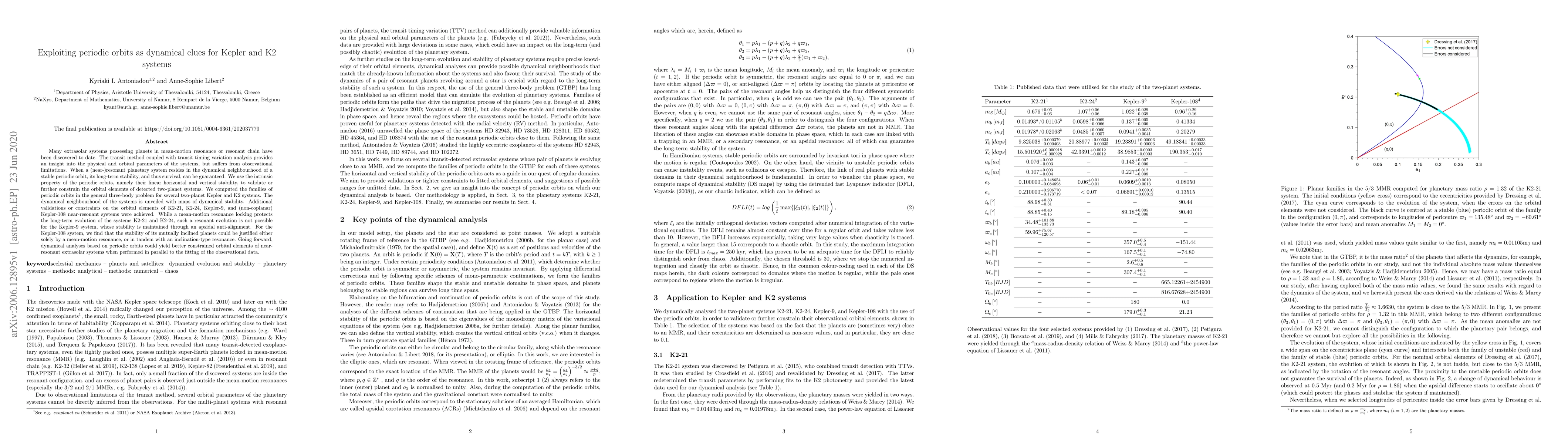 Many extrasolar systems possessing planets in mean-motion resonance or resonant chain have been discovered to date. The transit method coupled with transit timing variation analysis provides an insight into the physical and orbital parameters of the systems, but suffers from observational limitations. When a (near-)resonant planetary system resides in the dynamical neighbourhood of a stable periodic orbit, its long-term stability, and thus survival, can be guaranteed. We use the intrinsic property of the periodic orbits, namely their linear horizontal and vertical stability, to validate or further constrain the orbital elements of detected two-planet systems. We computed the families of periodic orbits in the general three-body problem for several two-planet Kepler and K2 systems. The dynamical neighbourhood of the systems is unveiled with maps of dynamical stability. Additional validations or constraints on the orbital elements of K2-21, K2-24, Kepler-9, and (non-coplanar) Kepler-108 near-resonant systems were achieved. While a mean-motion resonance locking protects the long-term evolution of the systems K2-21 and K2-24, such a resonant evolution is not possible for the Kepler-9 system, whose stability is maintained through an apsidal anti-alignment. For the Kepler-108 system, we find that the stability of its mutually inclined planets could be justified either solely by a mean-motion resonance, or in tandem with an inclination-type resonance. Going forward, dynamical analyses based on periodic orbits could yield better constrained orbital elements of near-resonant extrasolar systems when performed in parallel to the fitting of the observational data.
