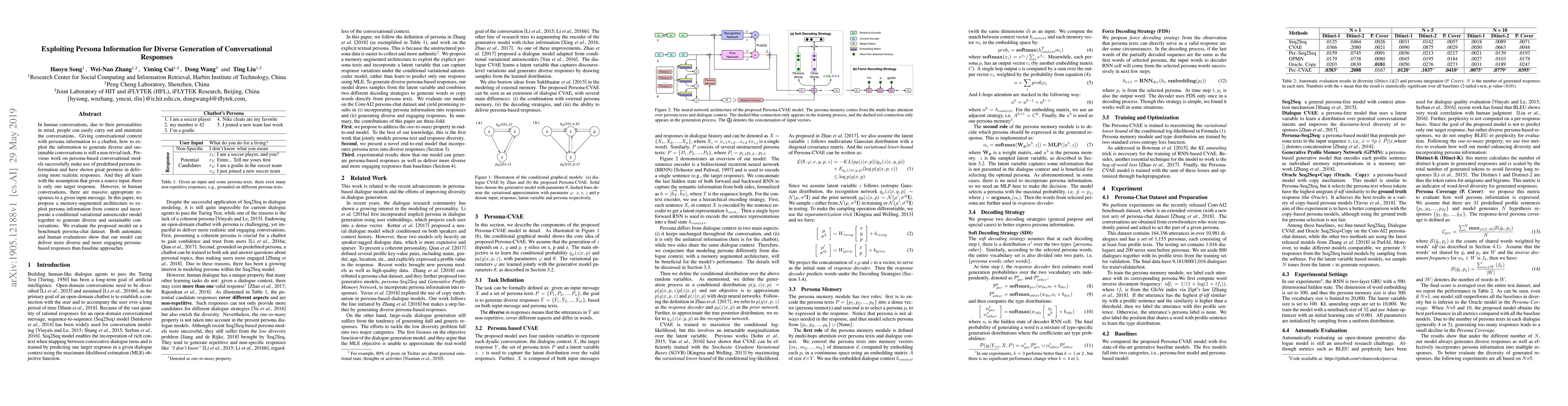 This paper proposes a memory-augmented architecture with a conditional variational autoencoder to generate diverse and sustainable conversational responses by exploiting persona information. Evaluations show the model produces more varied and engaging responses compared to baseline methods.