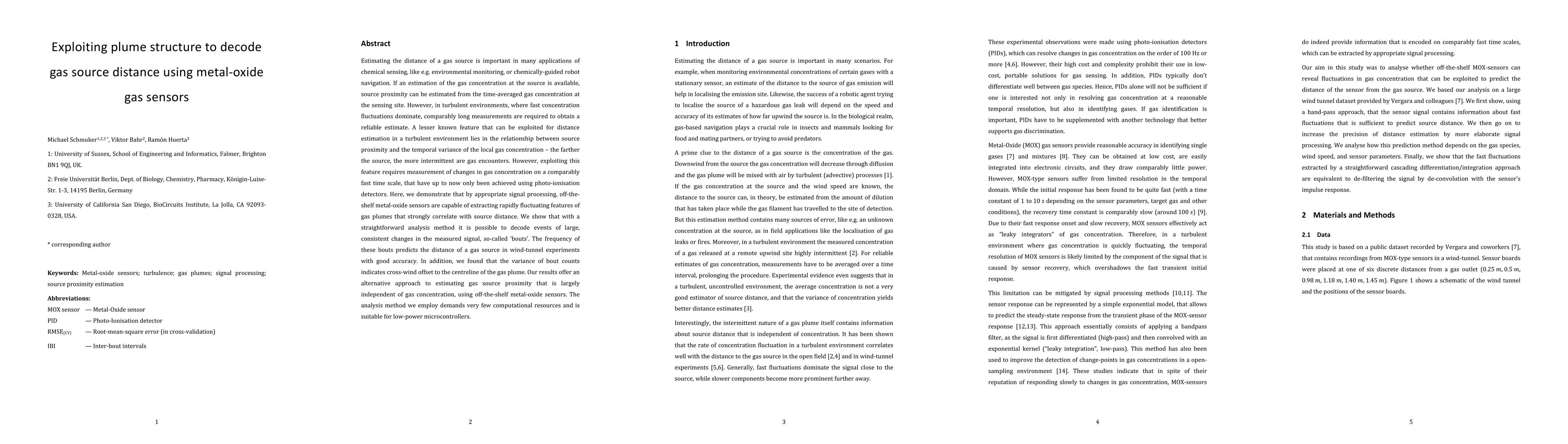 The paper presents a novel signal processing method for metal-oxide gas sensors that extracts rapidly fluctuating features of gas plumes to decode gas source distance, utilizing 'bouts' - events of large, consistent changes in the measured signal, which correlate with source distance.