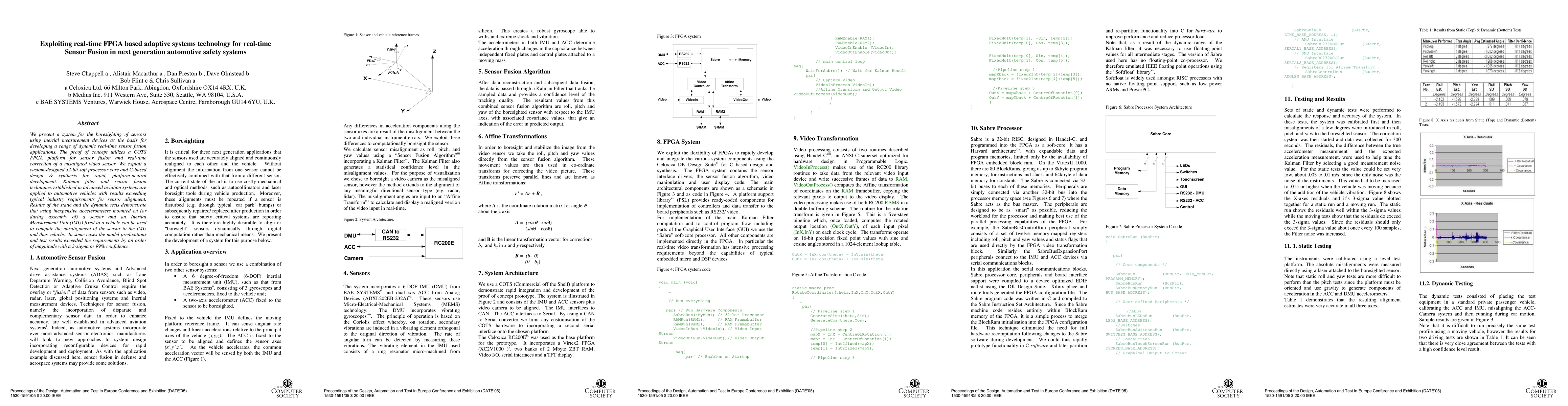 This paper explores the use of FPGA-based adaptive systems for real-time sensor fusion in automotive safety, demonstrating a system that corrects misaligned video sensors using inertial measurement devices. The approach employs a COTS FPGA platform, custom soft processor, and Kalman filter techniques to achieve superior sensor alignment accuracy.