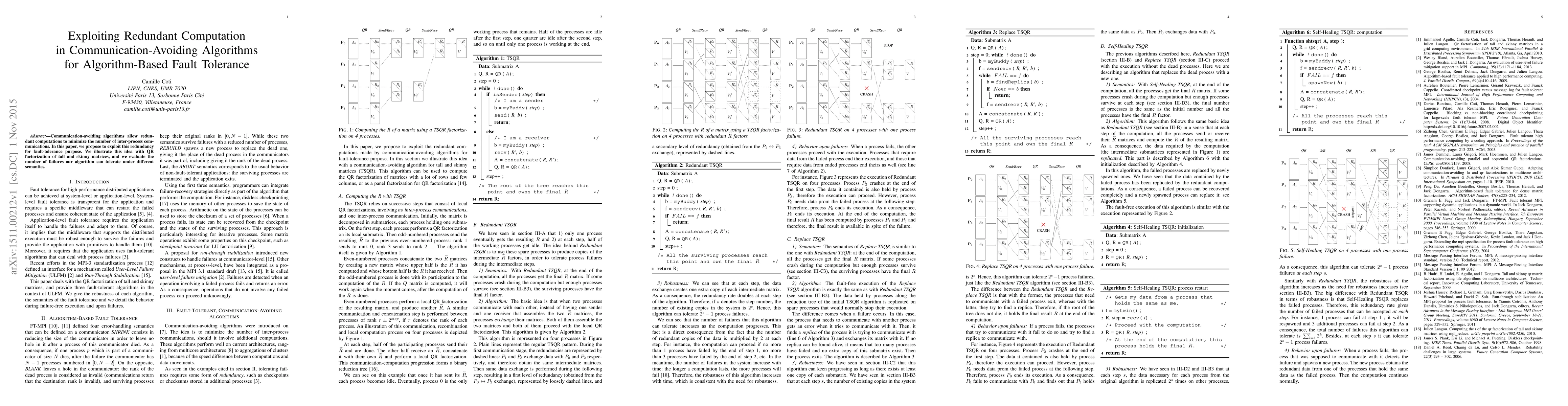 The paper proposes to exploit redundant computations in communication-avoiding algorithms for fault-tolerance purposes, illustrated with QR factorization of tall and skinny matrices.