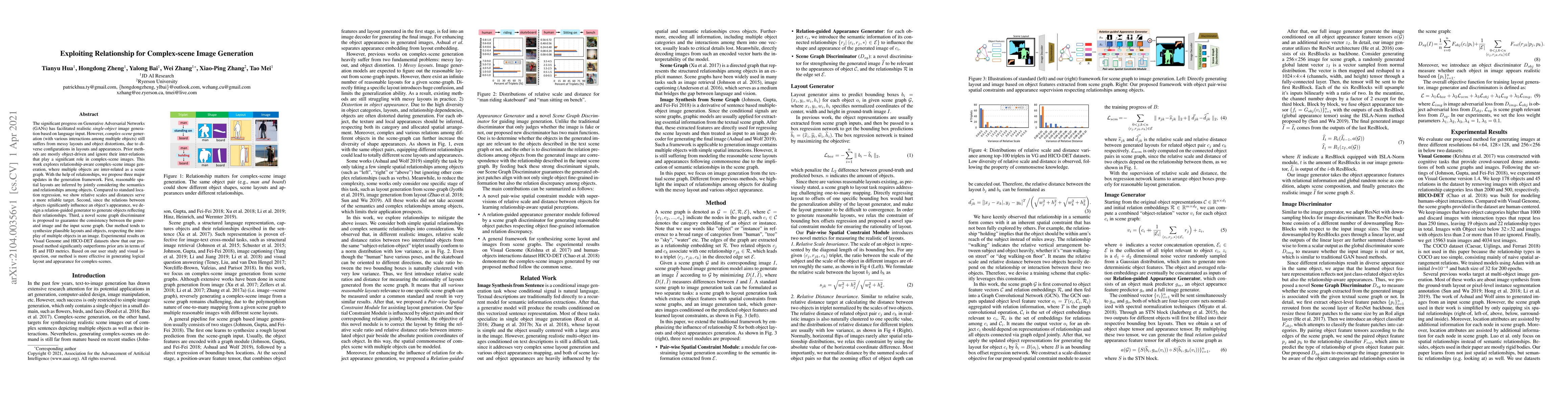 This paper proposes a novel method for generating complex-scene images by leveraging object relationships represented as a scene graph. The approach improves spatial layouts and object appearances by considering inter-object relations and introduces a scene graph discriminator to ensure consistency with the input scene graph, resulting in more plausible and logically structured images.