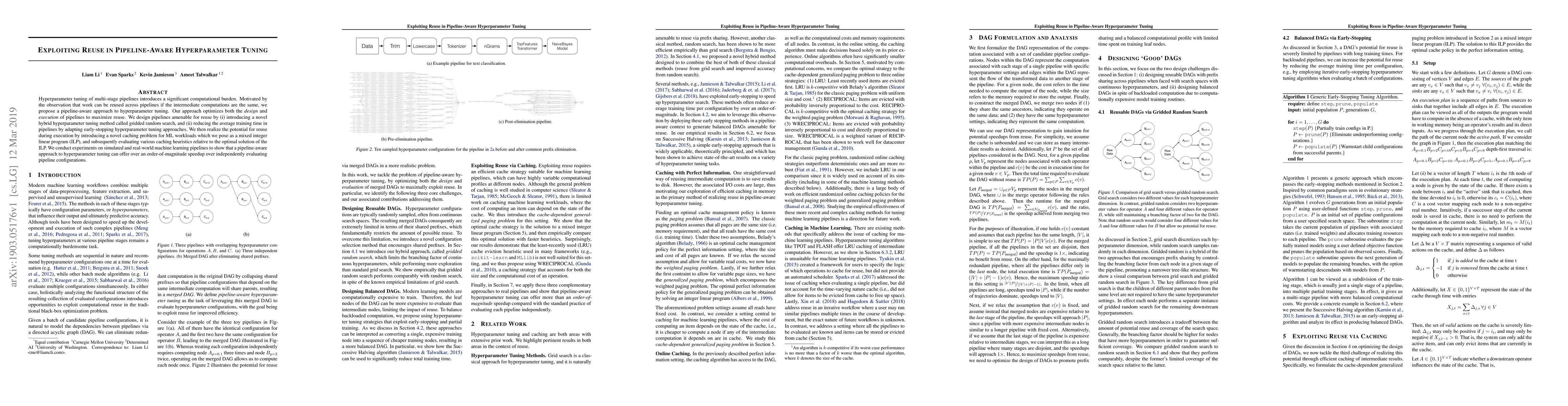 This paper proposes a pipeline-aware approach to hyperparameter tuning that maximizes reuse of intermediate computations, introducing a hybrid tuning method and early-stopping techniques to reduce training time. It formulates a caching problem as a mixed integer linear program and evaluates heuristics, demonstrating significant speedups over traditional methods.