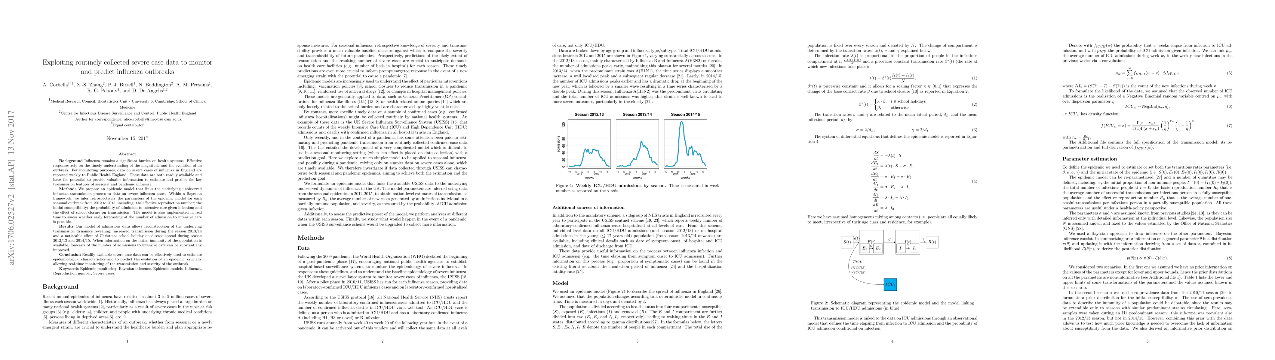 Influenza remains a significant burden on health systems. Effective responses rely on the timely understanding of the magnitude and the evolution of an outbreak. For monitoring purposes, data on severe cases of influenza in England are reported weekly to Public Health England. These data are both readily available and have the potential to provide valuable information to estimate and predict the key transmission features of seasonal and pandemic influenza. We propose an epidemic model that links the underlying unobserved influenza transmission process to data on severe influenza cases. Within a Bayesian framework, we infer retrospectively the parameters of the epidemic model for each seasonal outbreak from 2012 to 2015, including: the effective reproduction number; the initial susceptibility; the probability of admission to intensive care given infection; and the effect of school closure on transmission. The model is also implemented in real time to assess whether early forecasting of the number of admission to intensive care is possible. Our model of admissions data allows reconstruction of the underlying transmission dynamics revealing: increased transmission during the season 2013/14 and a noticeable effect of Christmas school holiday on disease spread during season 2012/13 and 2014/15. When information on the initial immunity of the population is available, forecasts of the number of admissions to intensive care can be substantially improved. Readily available severe case data can be effectively used to estimate epidemiological characteristics and to predict the evolution of an epidemic, crucially allowing real-time monitoring of the transmission and severity of the outbreak.