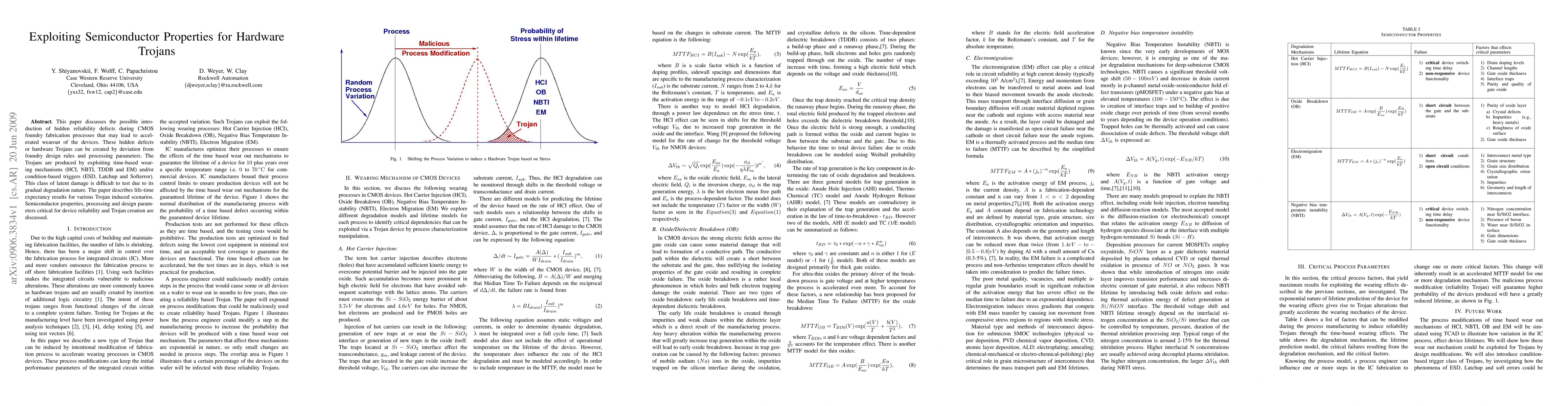 This paper discusses the possible introduction of hidden reliability defects during CMOS foundry fabrication processes that may lead to accelerated wearout of the devices. These hidden defects or hardware Trojans can be created by deviation from foundry design rules and processing parameters. The Trojans are produced by exploiting time-based wearing mechanisms (HCI, NBTI, TDDB and EM) and/or condition-based triggers (ESD, Latchup and Softerror). This class of latent damage is difficult to test due to its gradual degradation nature. The paper describes life-time expectancy results for various Trojan induced scenarios. Semiconductor properties, processing and design parameters critical for device reliability and Trojan creation are discussed.