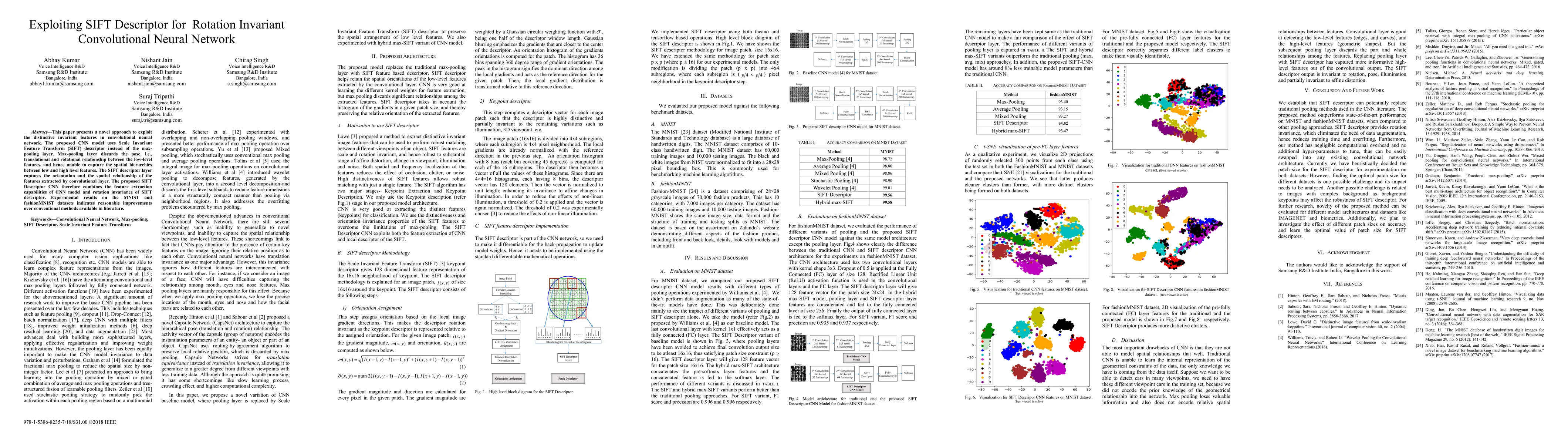 This paper proposes a CNN model that uses SIFT descriptors instead of max-pooling to capture orientation and spatial relationships, achieving rotation invariance. Experimental results show improvements over conventional methods on MNIST and fashionMNIST datasets.