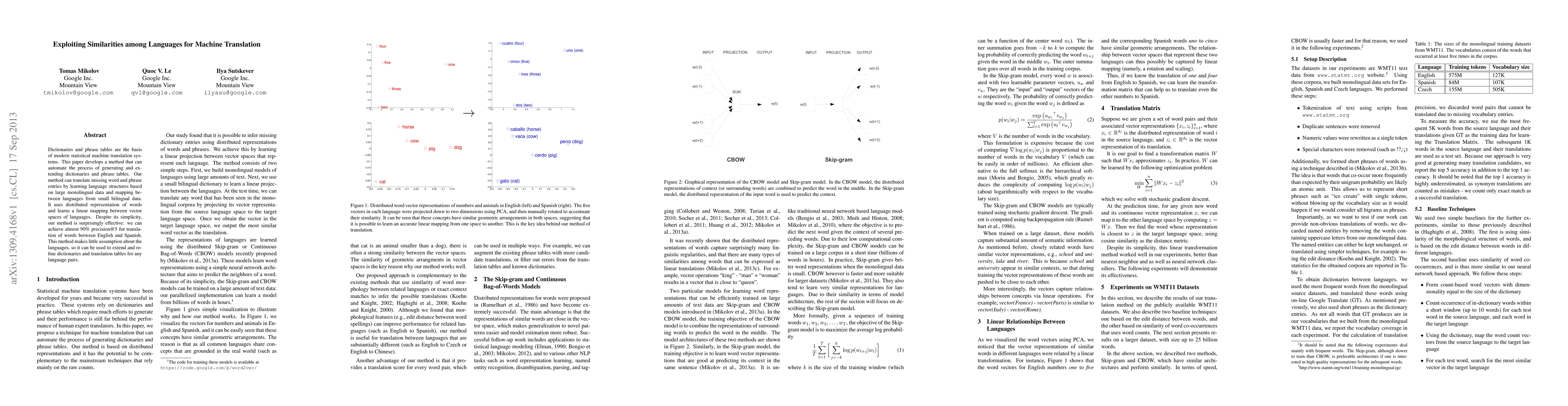 A new method automates dictionary and phrase table generation for machine translation, using large monolingual data and mapping between languages from small bilingual data to achieve 90% precision@5 in translating words between English and Spanish.