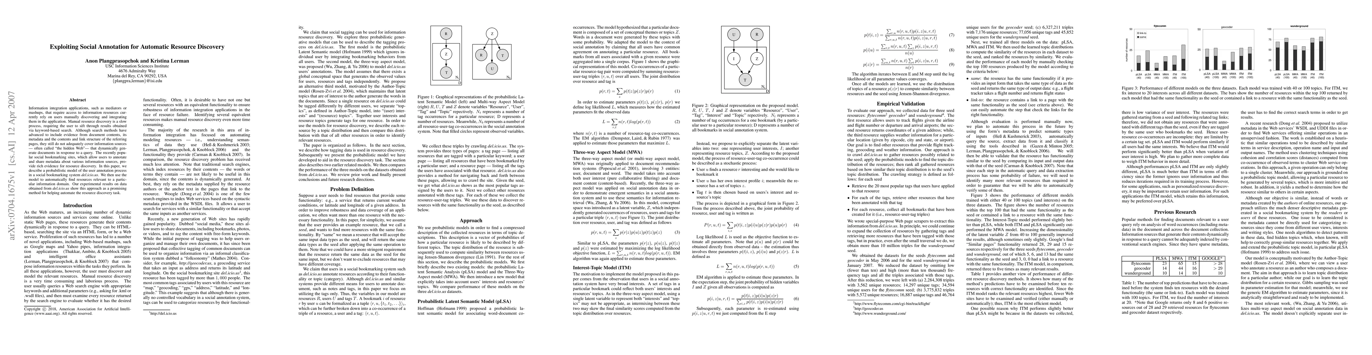 Information integration applications, such as mediators or mashups, that require access to information resources currently rely on users manually discovering and integrating them in the application. Manual resource discovery is a slow process, requiring the user to sift through results obtained via keyword-based search. Although search methods have advanced to include evidence from document contents, its metadata and the contents and link structure of the referring pages, they still do not adequately cover information sources -- often called ``the hidden Web''-- that dynamically generate documents in response to a query. The recently popular social bookmarking sites, which allow users to annotate and share metadata about various information sources, provide rich evidence for resource discovery. In this paper, we describe a probabilistic model of the user annotation process in a social bookmarking system del.icio.us. We then use the model to automatically find resources relevant to a particular information domain. Our experimental results on data obtained from \emph{del.icio.us} show this approach as a promising method for helping automate the resource discovery task.