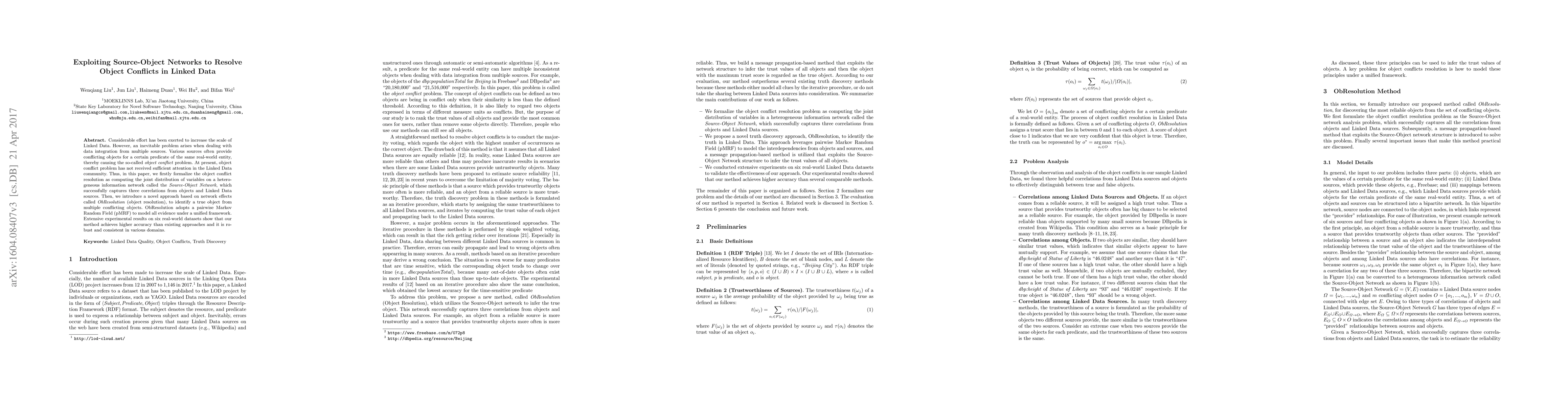 This paper formalizes the object conflicts resolution problem in Linked Data as computing the joint distribution on a Source-Object Network, introducing ObResolution to identify true objects using a pairwise Markov Random Field. Experimental results demonstrate higher accuracy and robustness compared to existing methods.